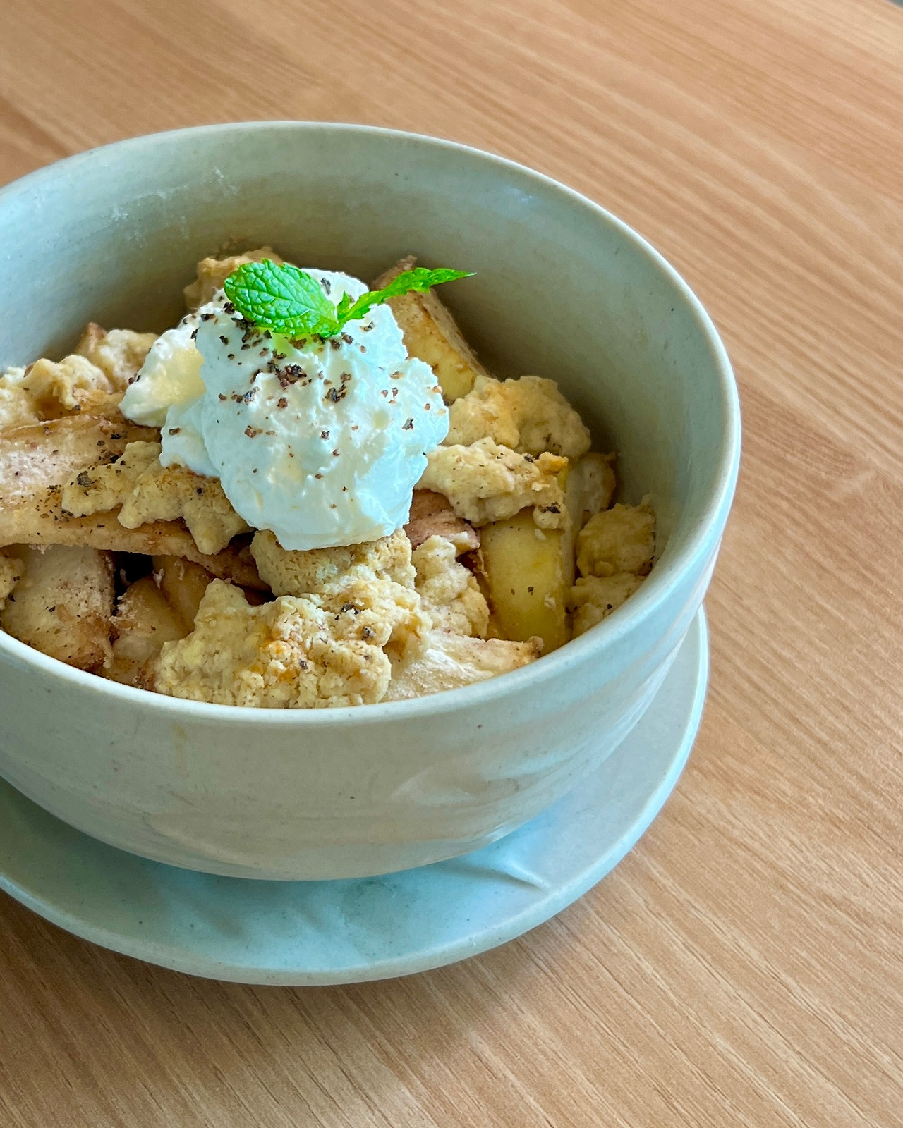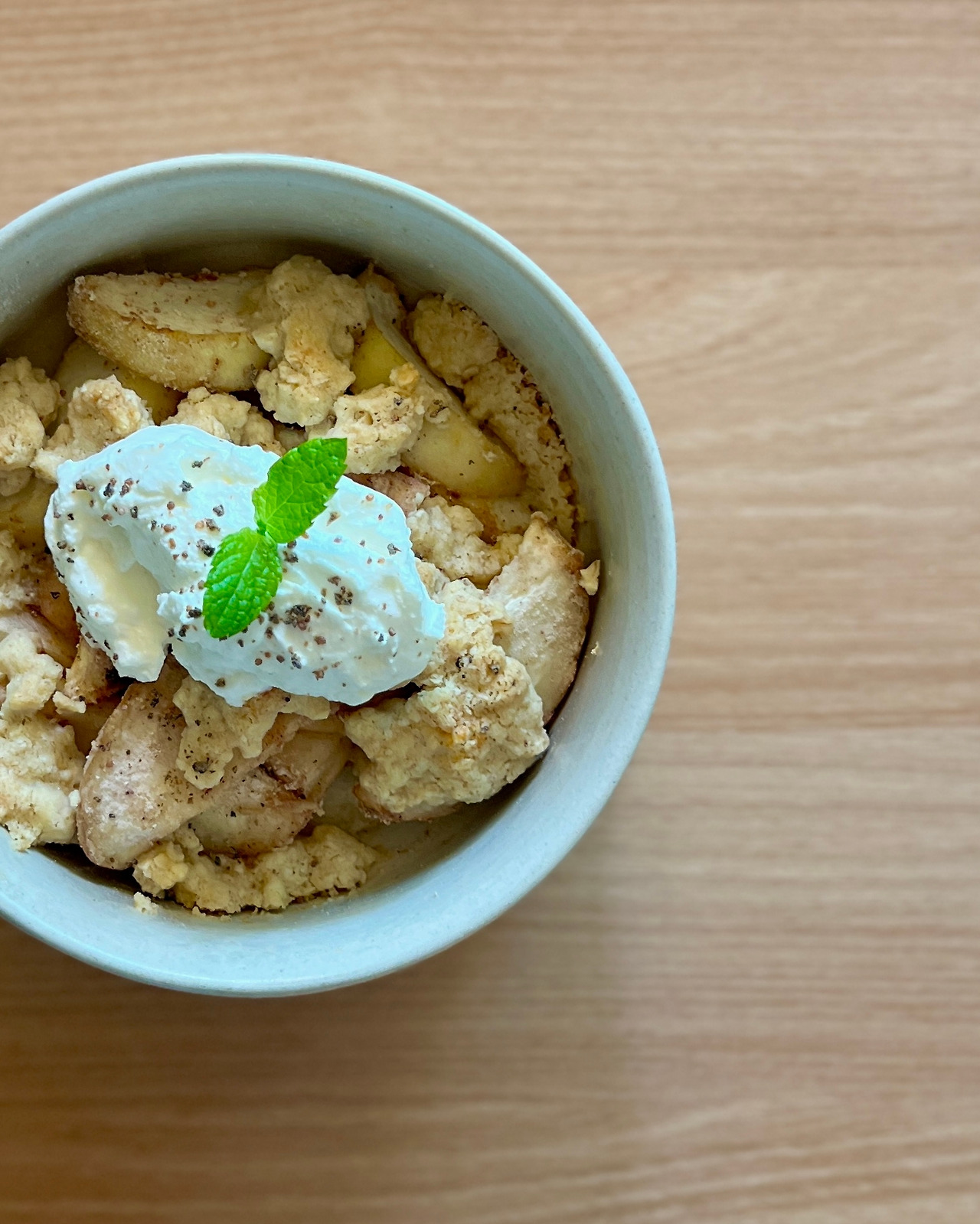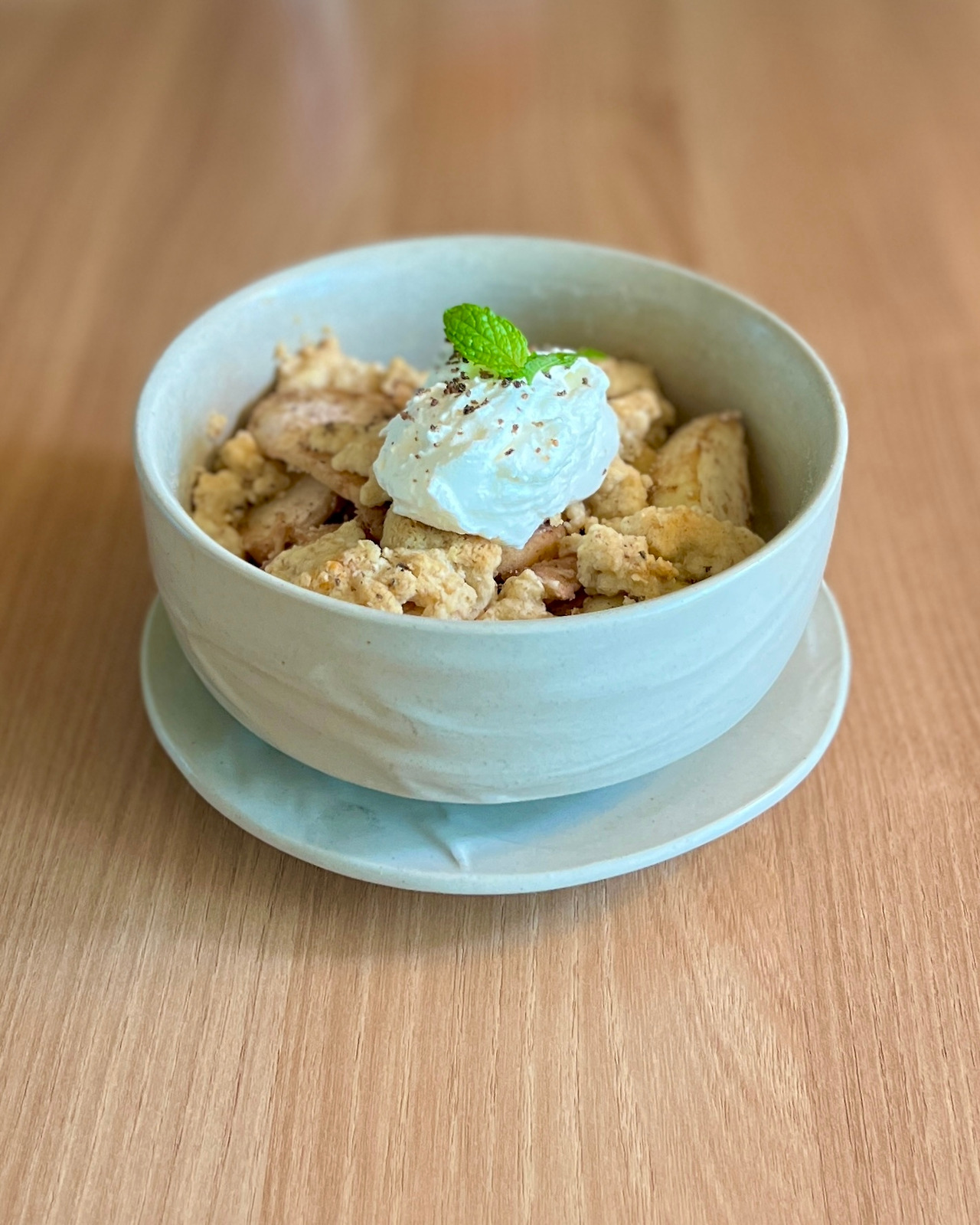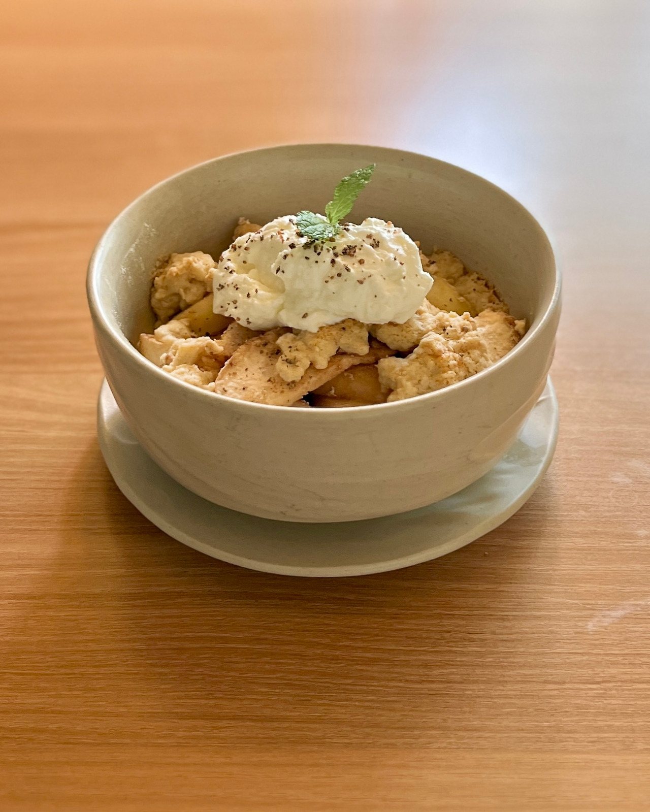 복숭아 1개, 밀가루 1T, 설탕 1t, 시나몬 1t, 그릭요거트 1T, 롱페퍼와 민트, (크리스프 토핑) 녹인 버터 2T, 밀가루 3T, 오트밀 2T, 소금 1t