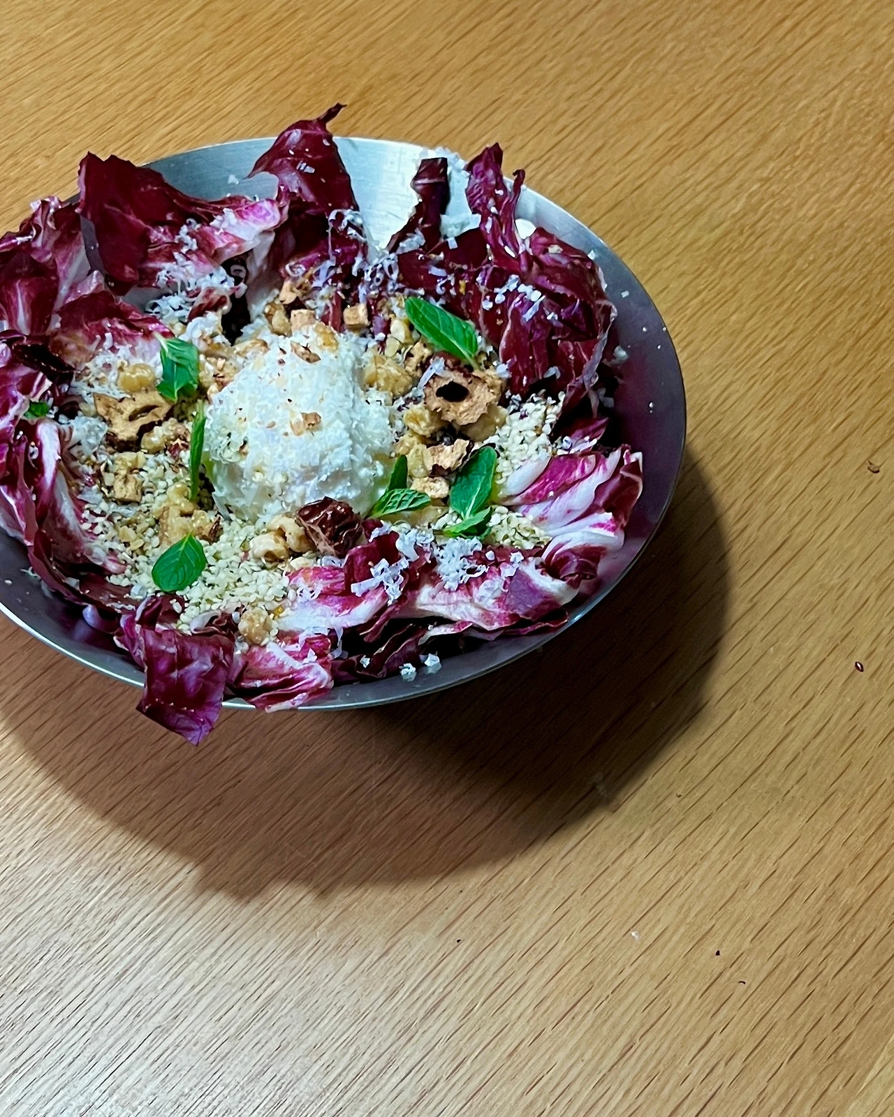 라디키오 1/2개, 프라이드 샬롯 1T, 호두 1T, 햄프시드 1T, 잘 말린 대추 조금, (드레싱) 오렌지 2개 제스트와 1개 주스에 발사믹 글레이즈 1T, 발사믹 비니거 1T, 올리브오일 3T, 소금과 후추 각각 한 꼬집