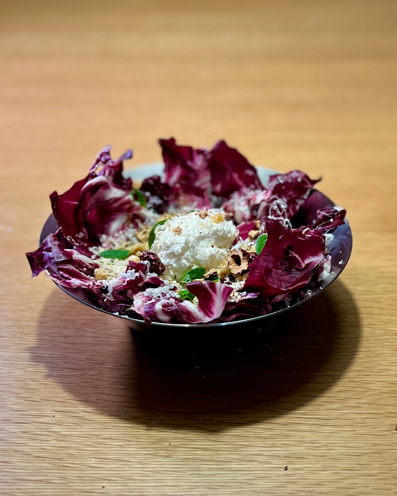 2. 라디키오는 잎을 뗀 뒤 길게 썰어서 접시에 담는다. 1의 드레싱을 붓는다. 리코타치즈 1 스쿱, 그라나파다노 치즈 갈아서 얹는다.