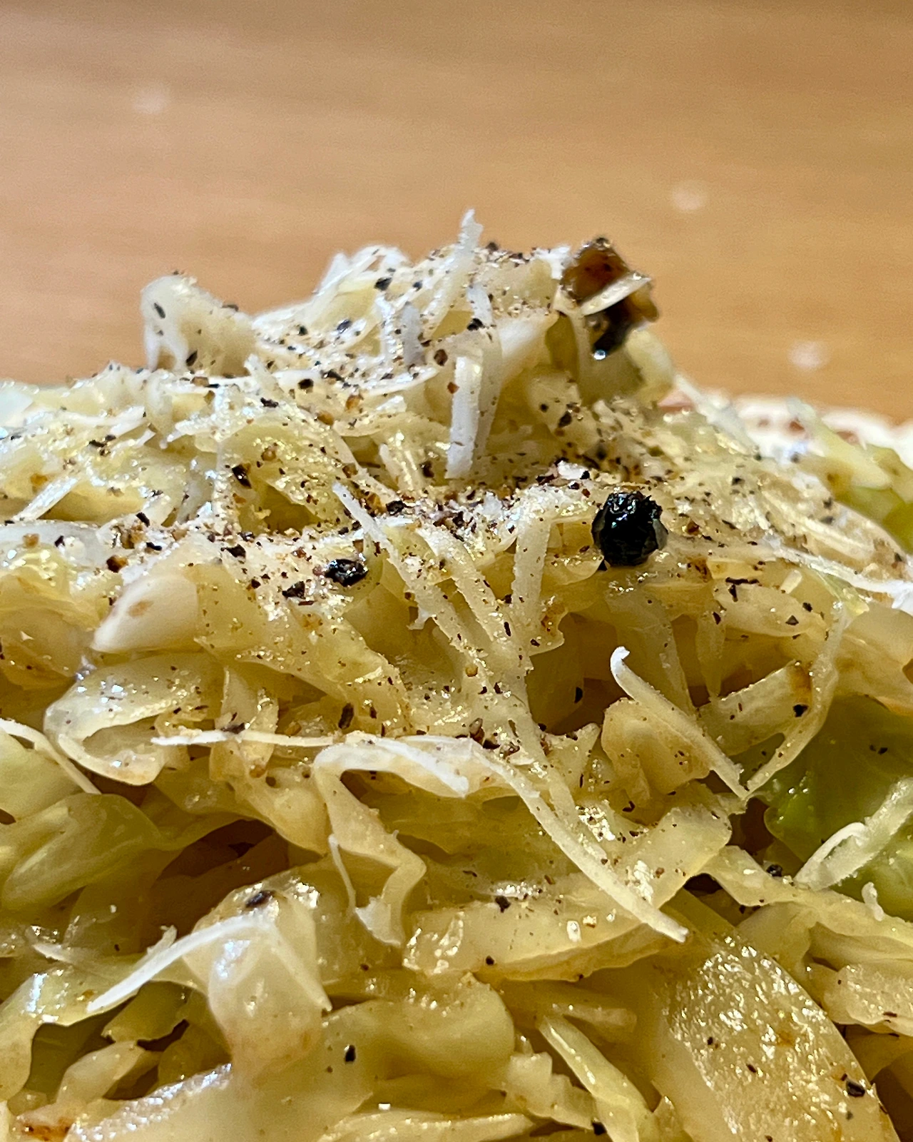 카치오 Cacio는 치즈, 페페 Pepe는 후추, 그래서 카치오 페페는 (페코리노 로마노) 치즈와 후추만으로 만드는 간단한 이탈리아 파스타다. 오늘은 파스타면 대신에 양배추로 만드는 카치오 페페 캐비지다.