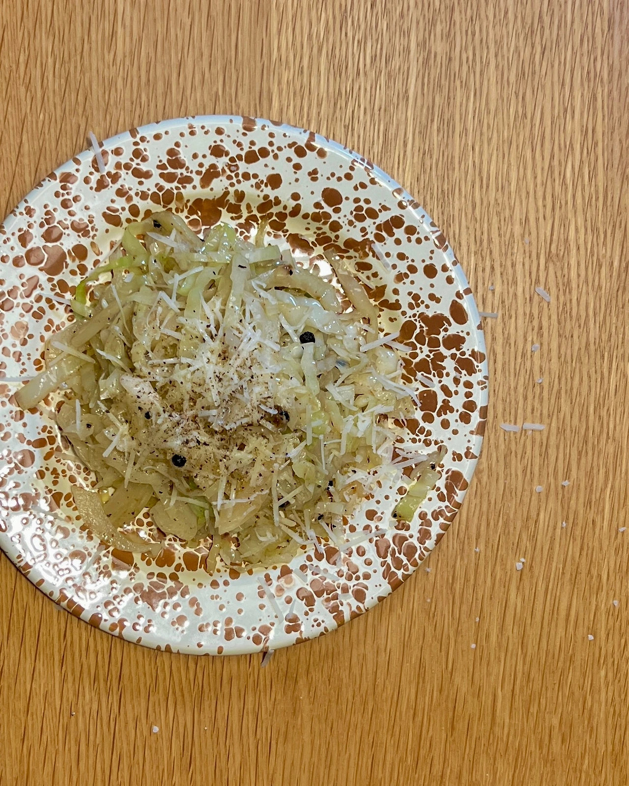 6. 접시에 양배추를 담고 페코리노 로마노 치즈와 후추 얹는다. 레몬 조금 뿌리면 좋을 것 같다.