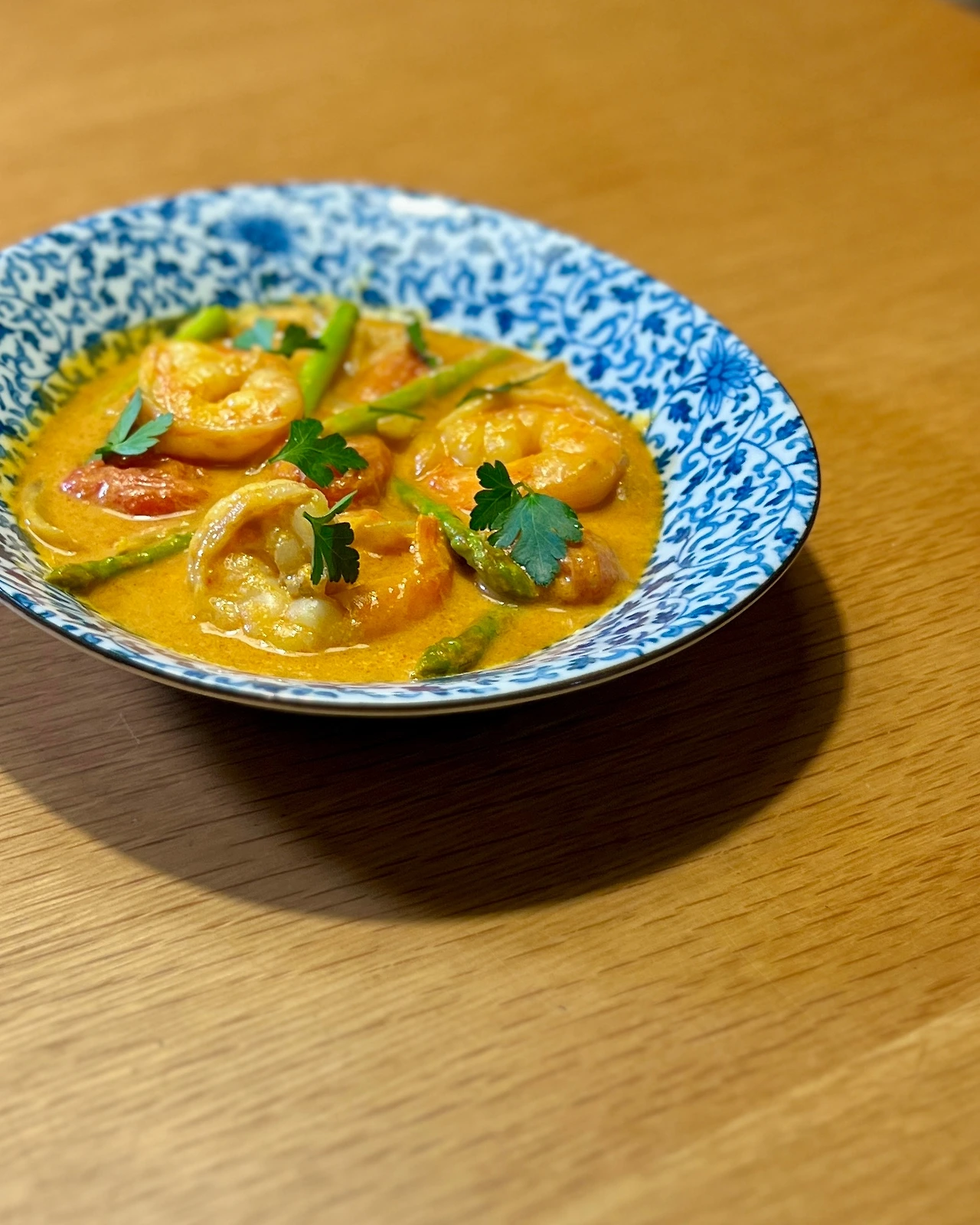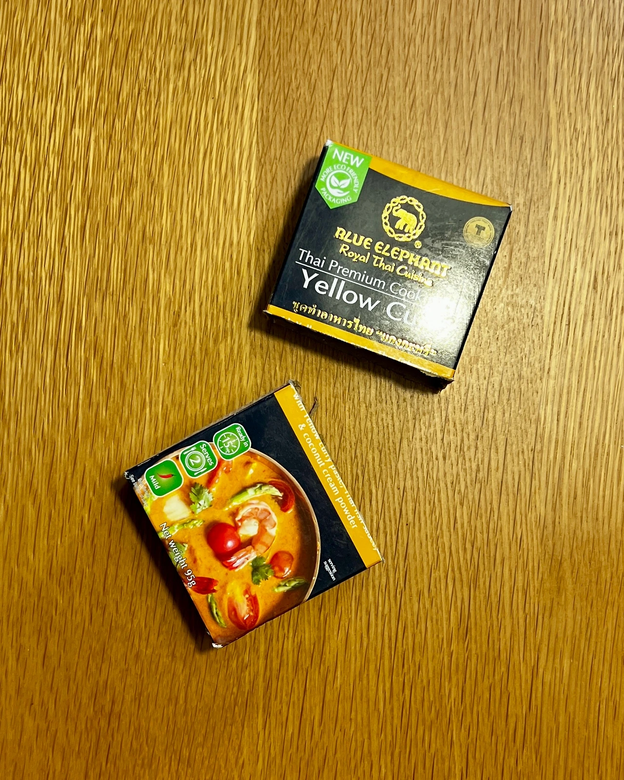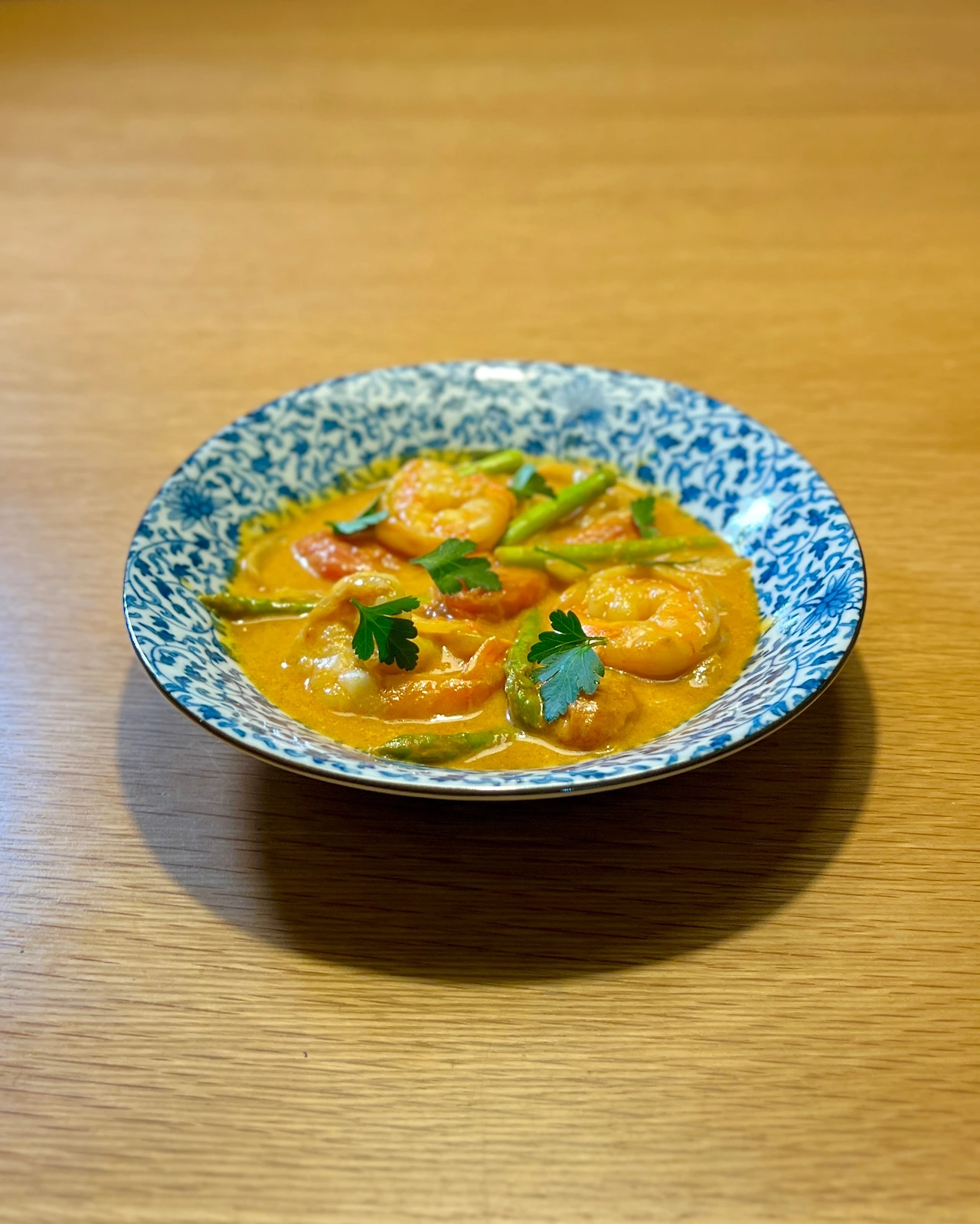 블루엘리펀트 옐로 커리 1개(옐로우 커리 페이스트, 코코넛 크림 파우더, 타이 피시소스 포함), 방울토마토 5개, 새우 3마리, 아스파라거스 5개, 양파 1/2개, 코코넛슈가 1t, (고수가 없으니) 파슬리 조금