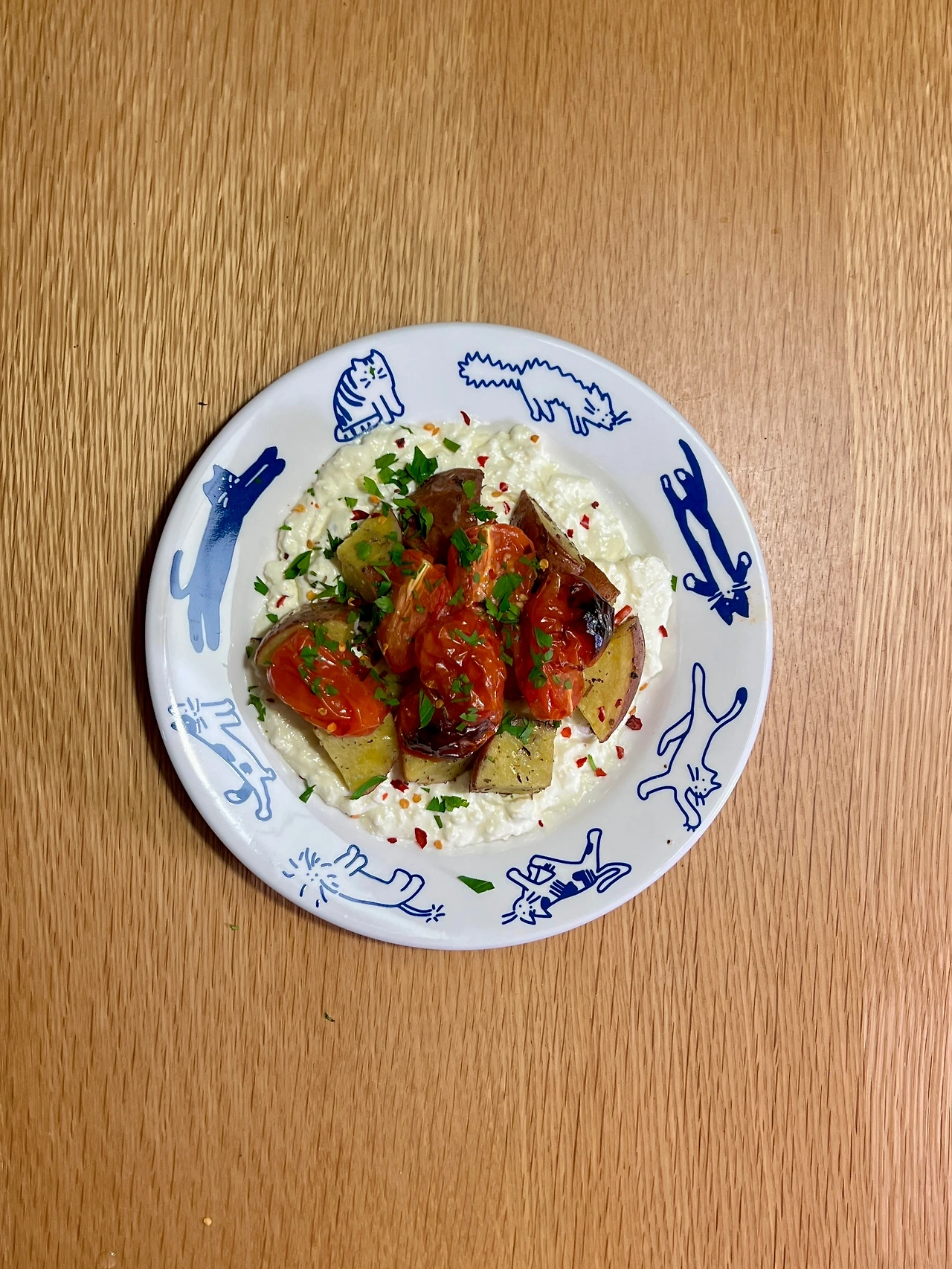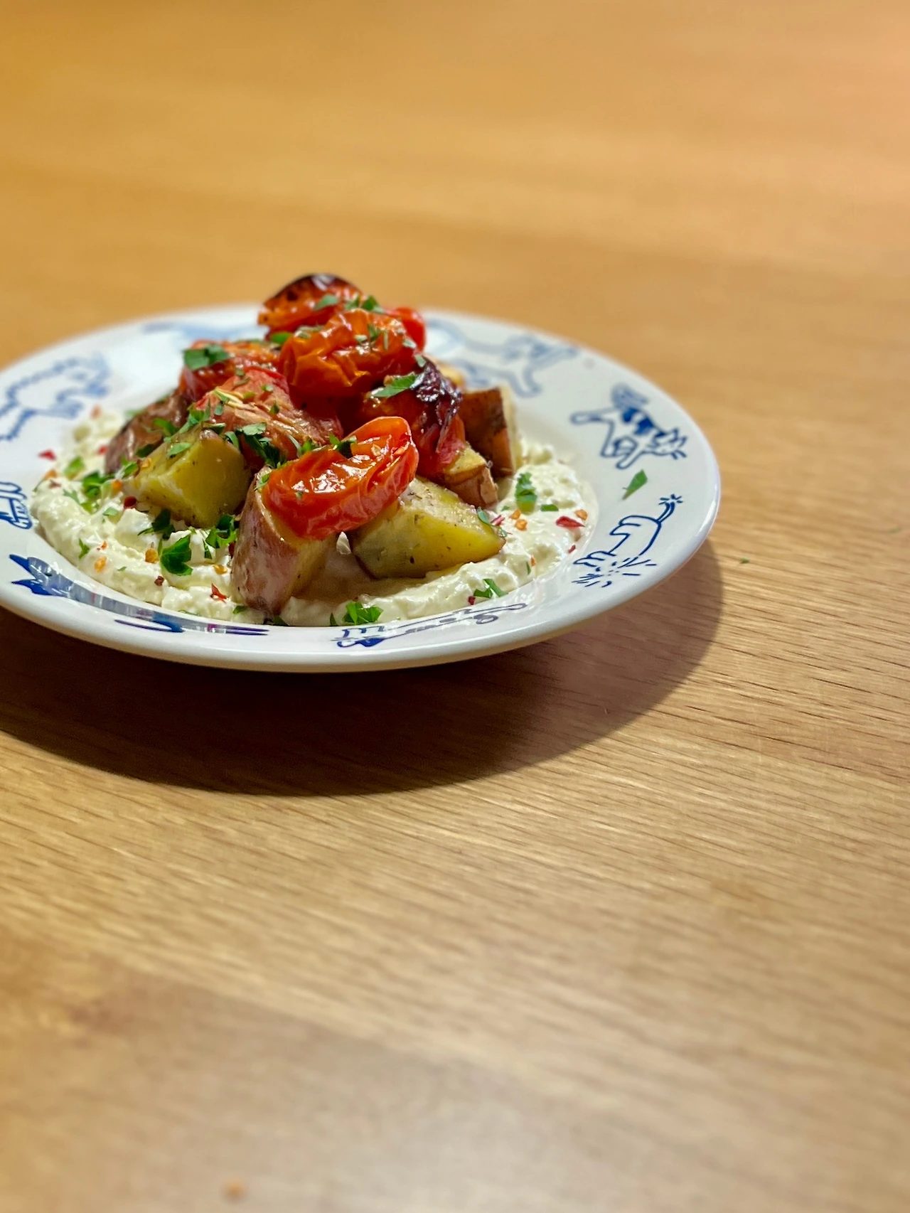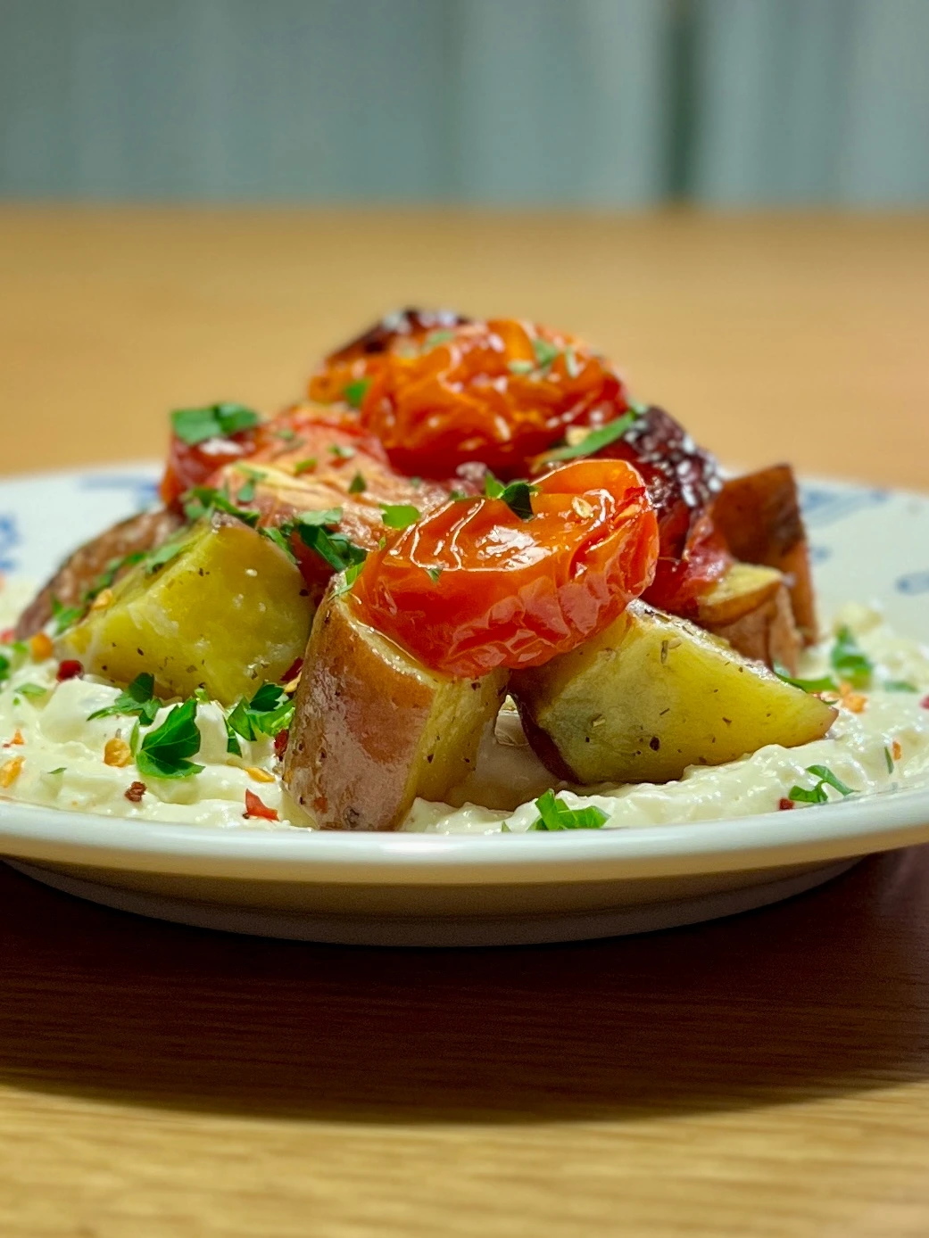 5. 접시에 3의 수제 휘핑 화이트치즈 담고, 감자, 토마토 순서로 얹는다. 다진 파슬리 조금, 올리브오일, 레드페퍼 플레이크 조금 얹는다.