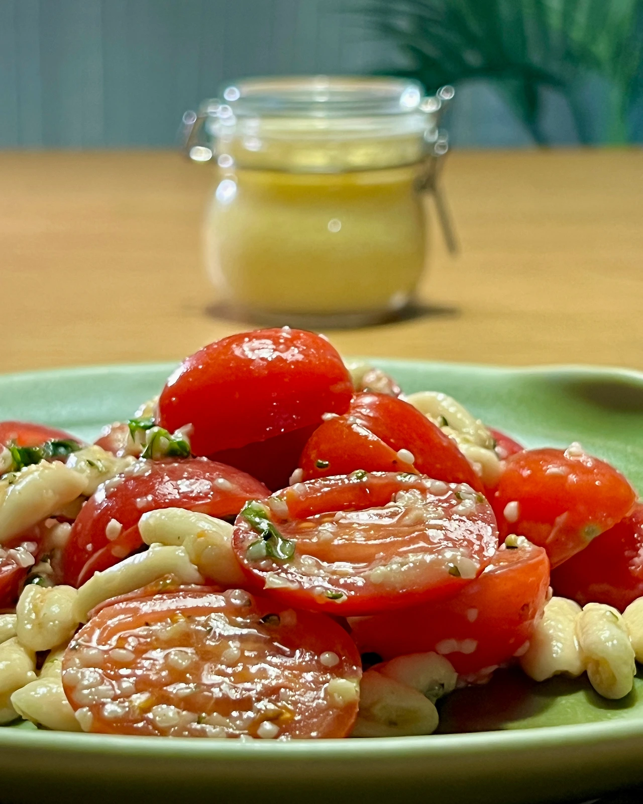 숏파스타 1컵, 햄프시드 1T, 방울토마토 10개, 다진마늘 1t, 레몬소금 1/2t, 바질 잎 3~4장, 올리브오일 2T
