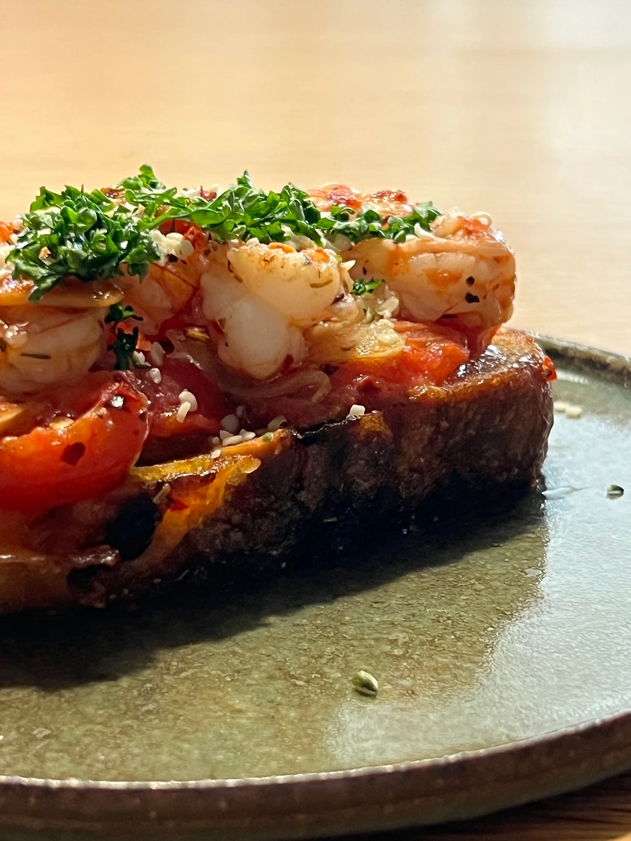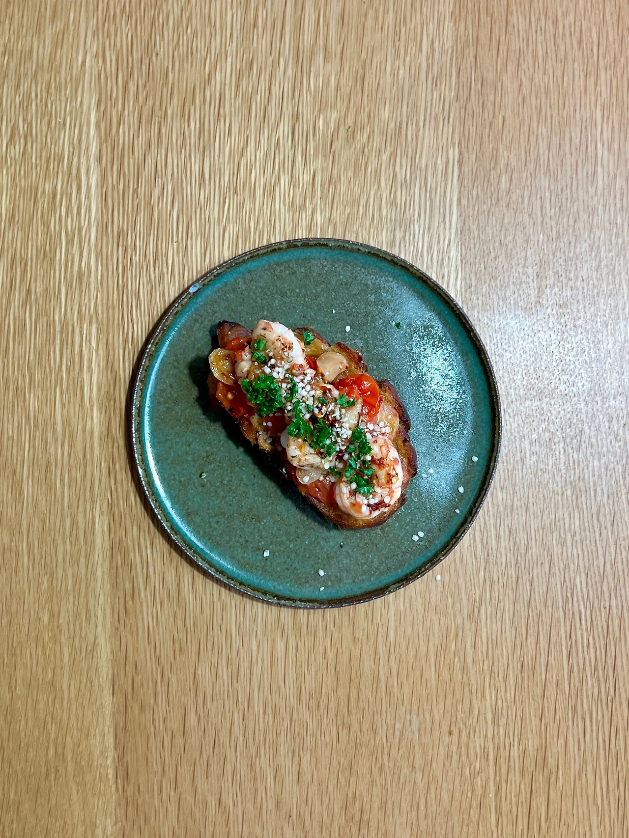 2. 살구 깜빠뉴 위에 토마토, 새우. 순서로 얹은 뒤 접시에 담고 햄프시드 1T, 다진 파슬리 조금 얹는다.
