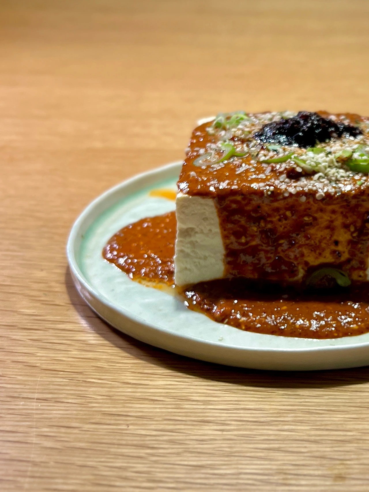 4. 접시에 3의 두부 담고 2의 소스를 얹는다. 다진 대파와 칠리 크리스프, 햄프시드 1T 얹는다.