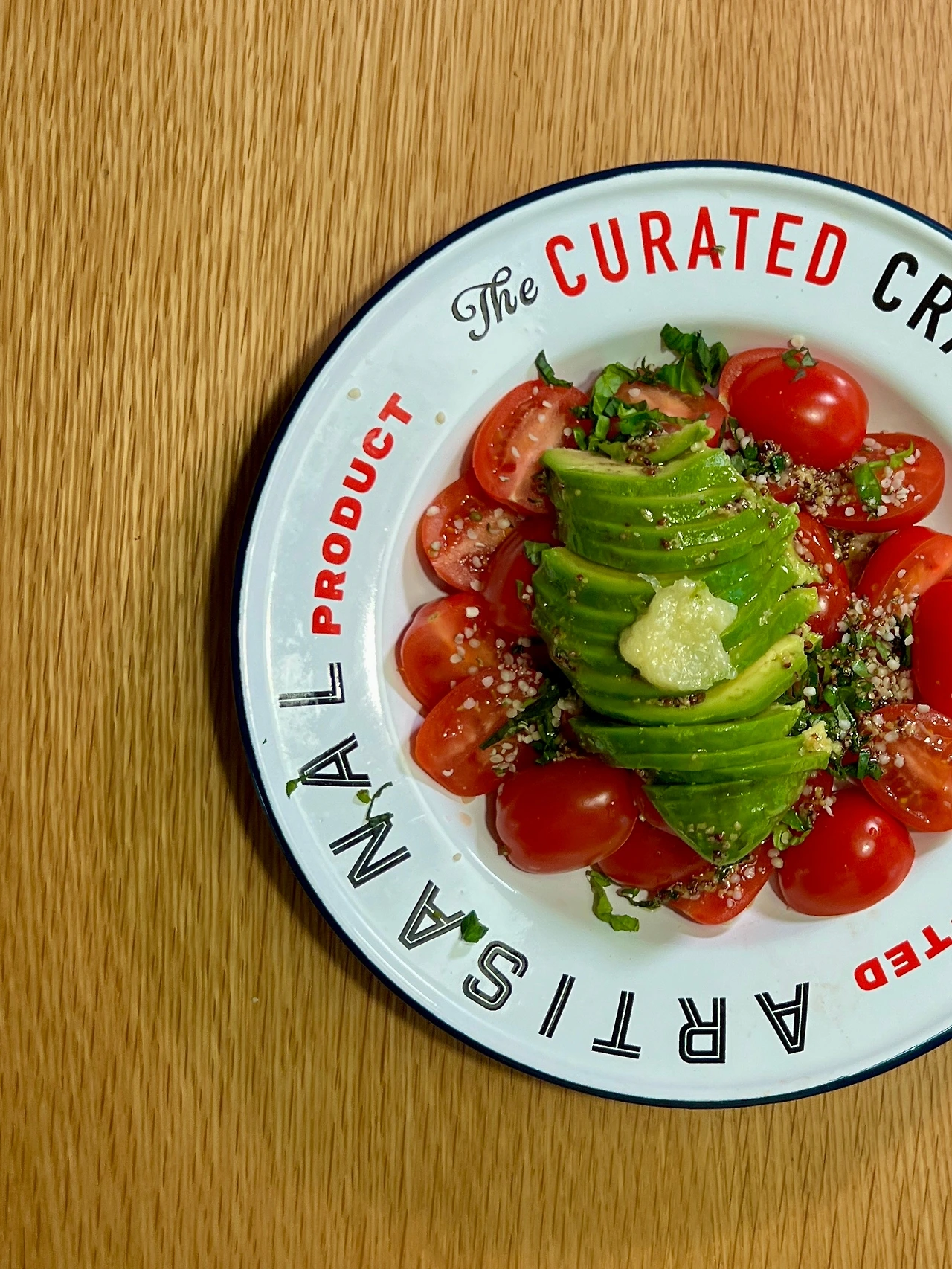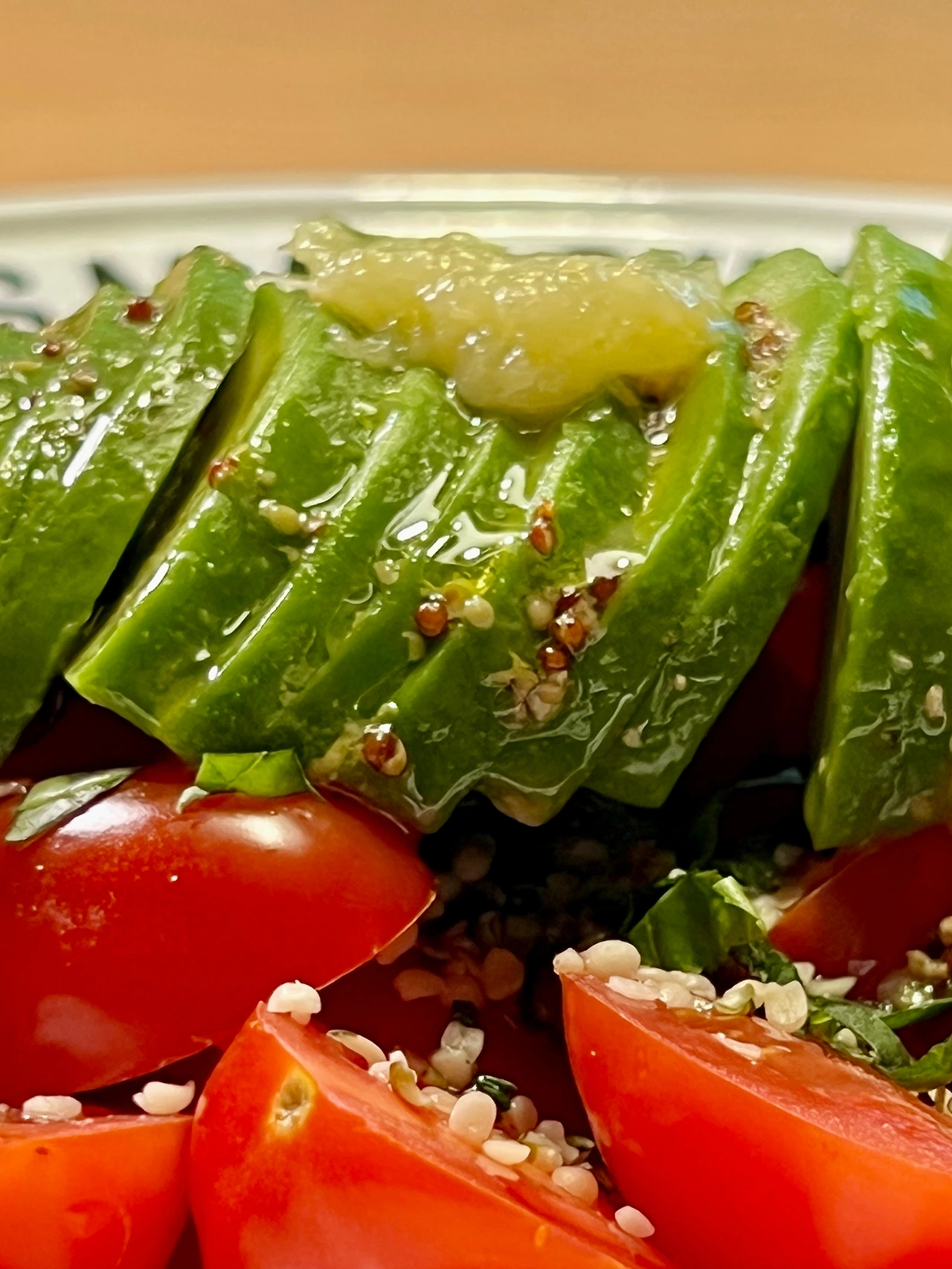 방울토마토 2컵, 바질 조금, 햄프시드 1T, 아보카도 1/2개, 비네그레트 드레싱, 레몬소금(선택)