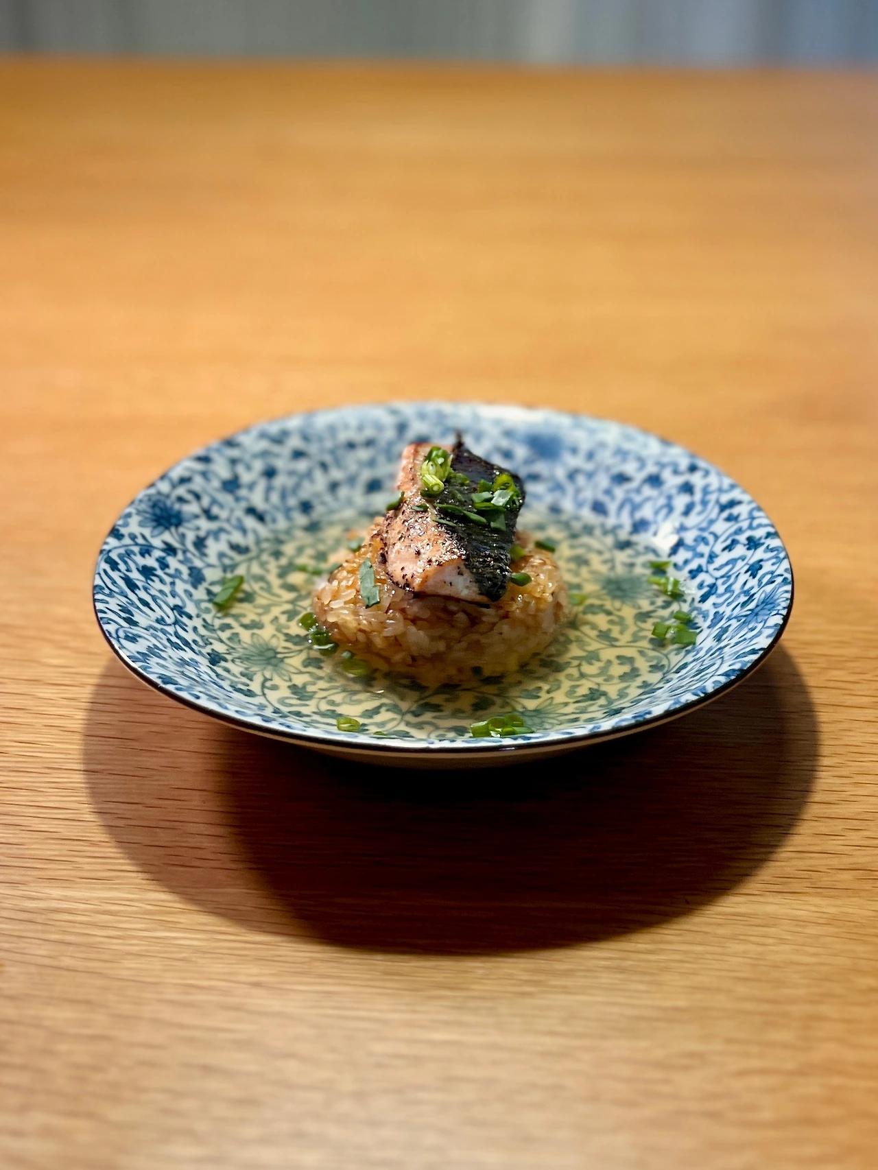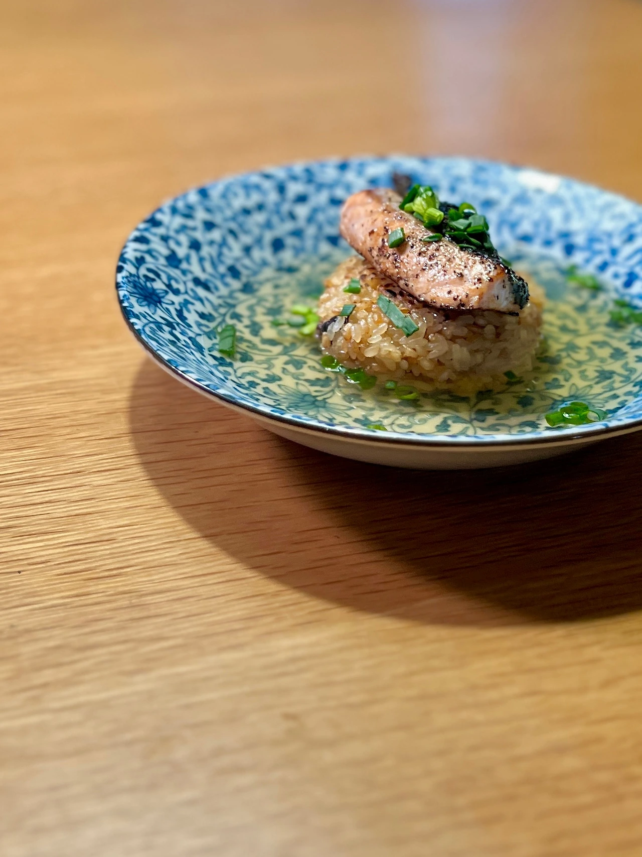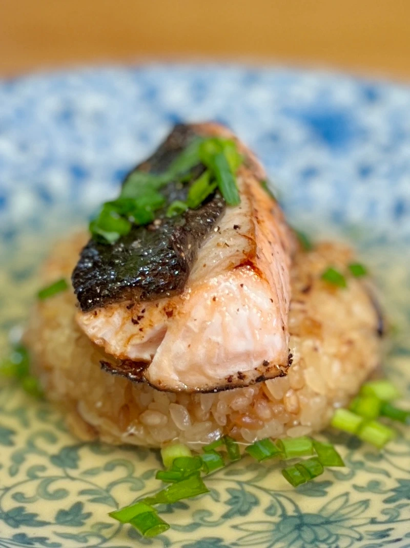 4. 그릇에 1의 구운 오니기리 담고 2의 연어 얹는다. 쪽파 조금 얹을까? 얹자. 3의 다시 국물 붓는다.