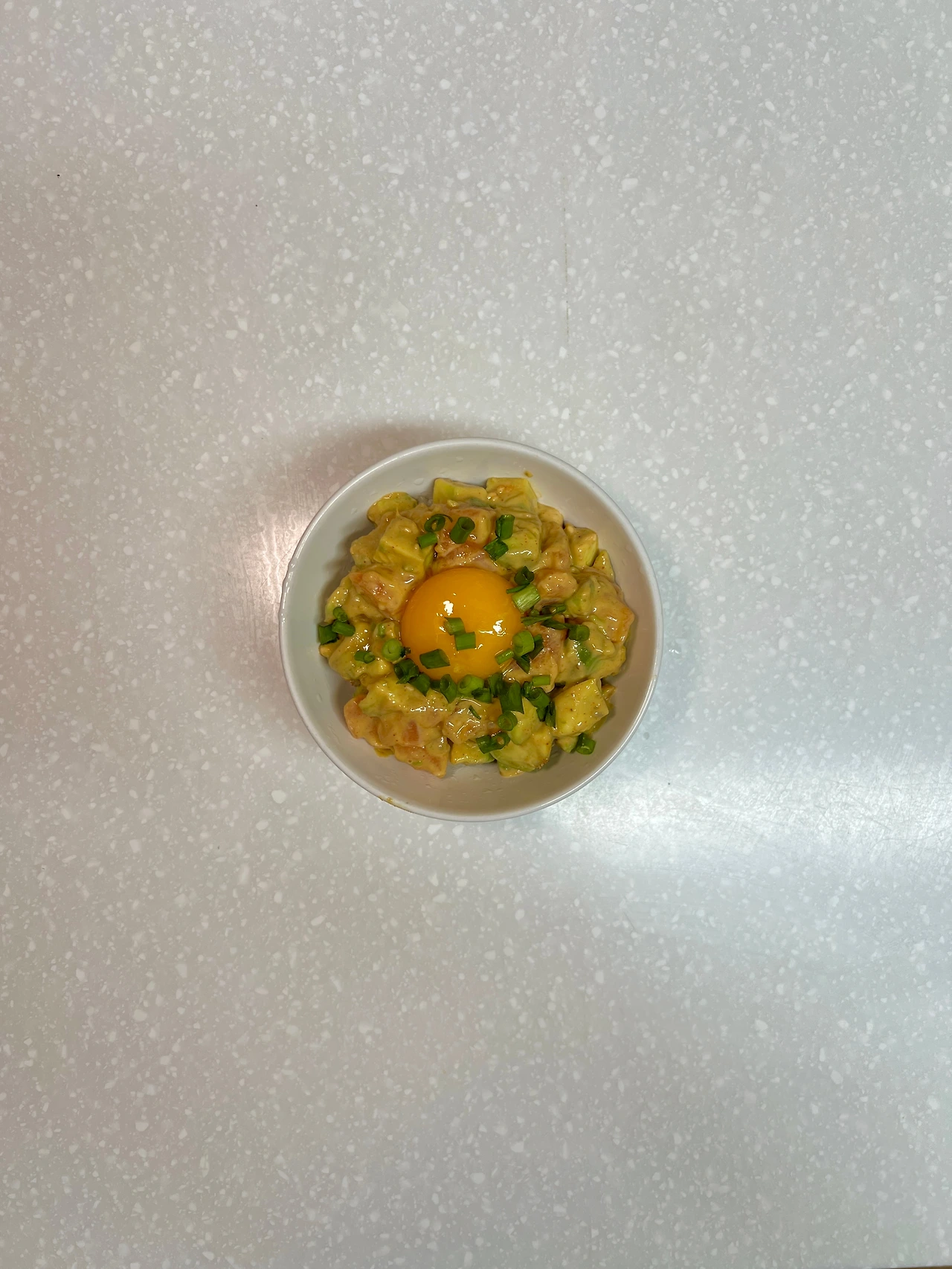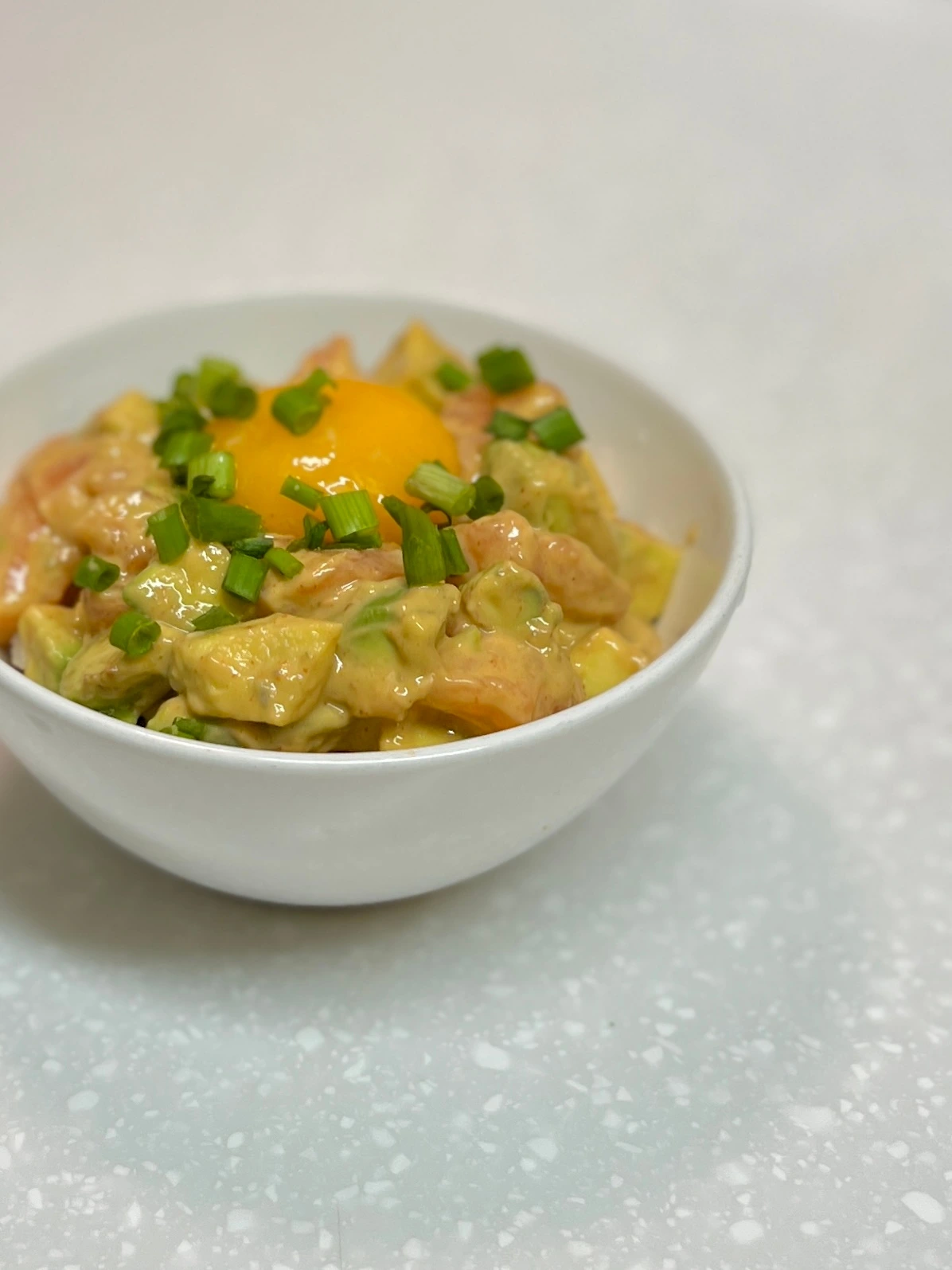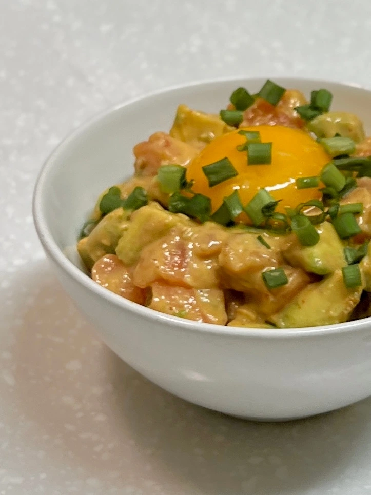 3. 현미밥 1/2 위에 2의 연어와 아보카도, 다진 쪽파, 계란노른자 얹는다.