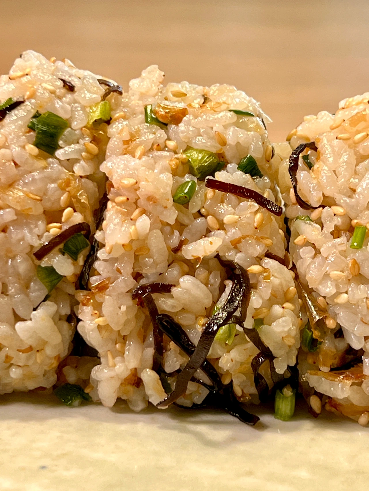 밥 250g, 시오콤부 10g, 쪽파 2T, 가쓰오부시 한 줌, 참깨 1T, 참기름 2t