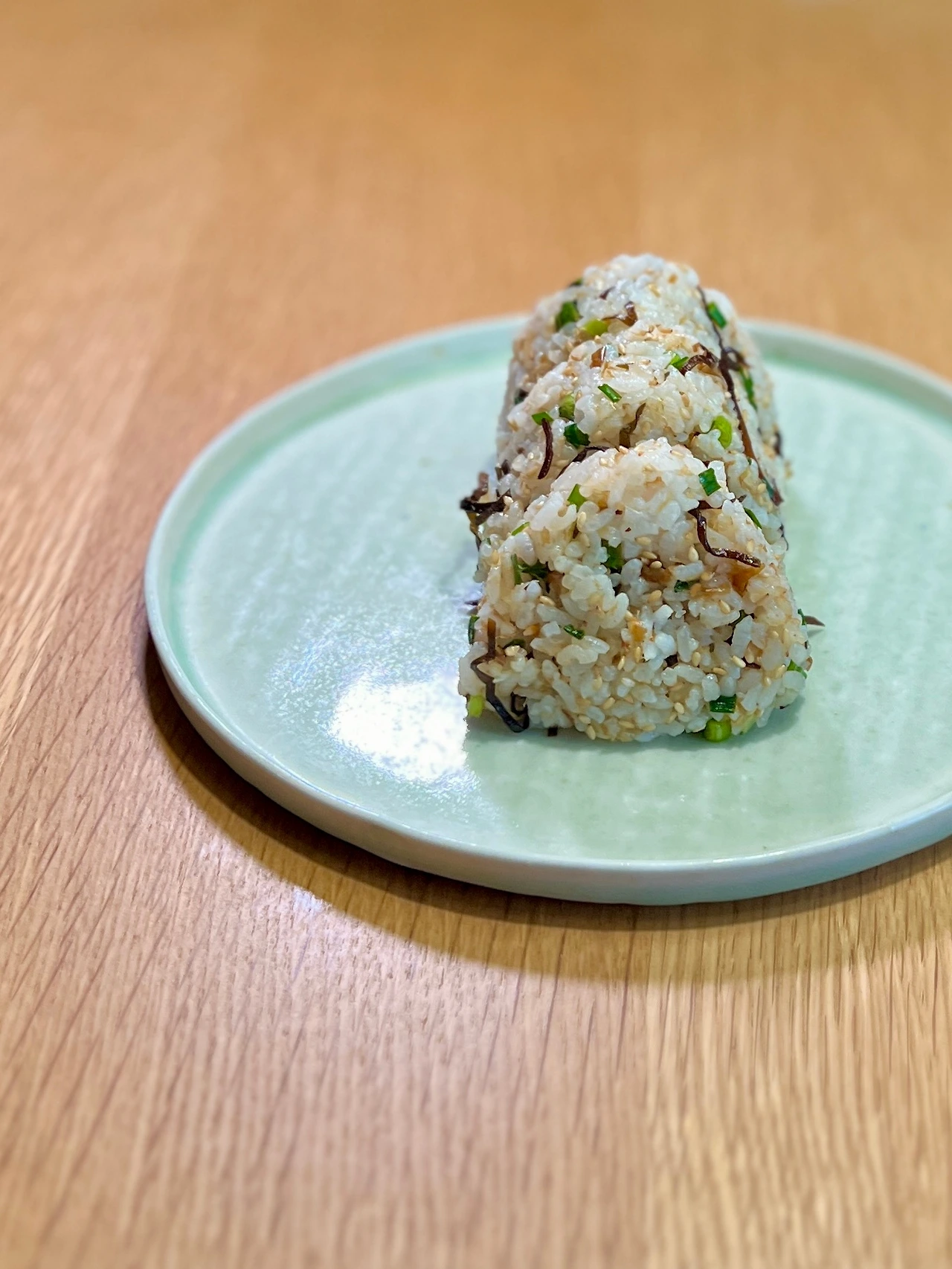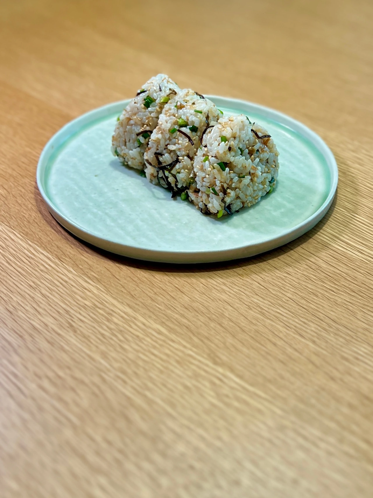 1. 믹싱볼에 밥 250g, 시오콤부 10g, 쪽파 2T, 가쓰오부시 한 줌, 참깨 1T, 참기름 2t 넣고 잘 섞어서 틀에 넣고 살짝 눌러서 오니기리를 만든다.