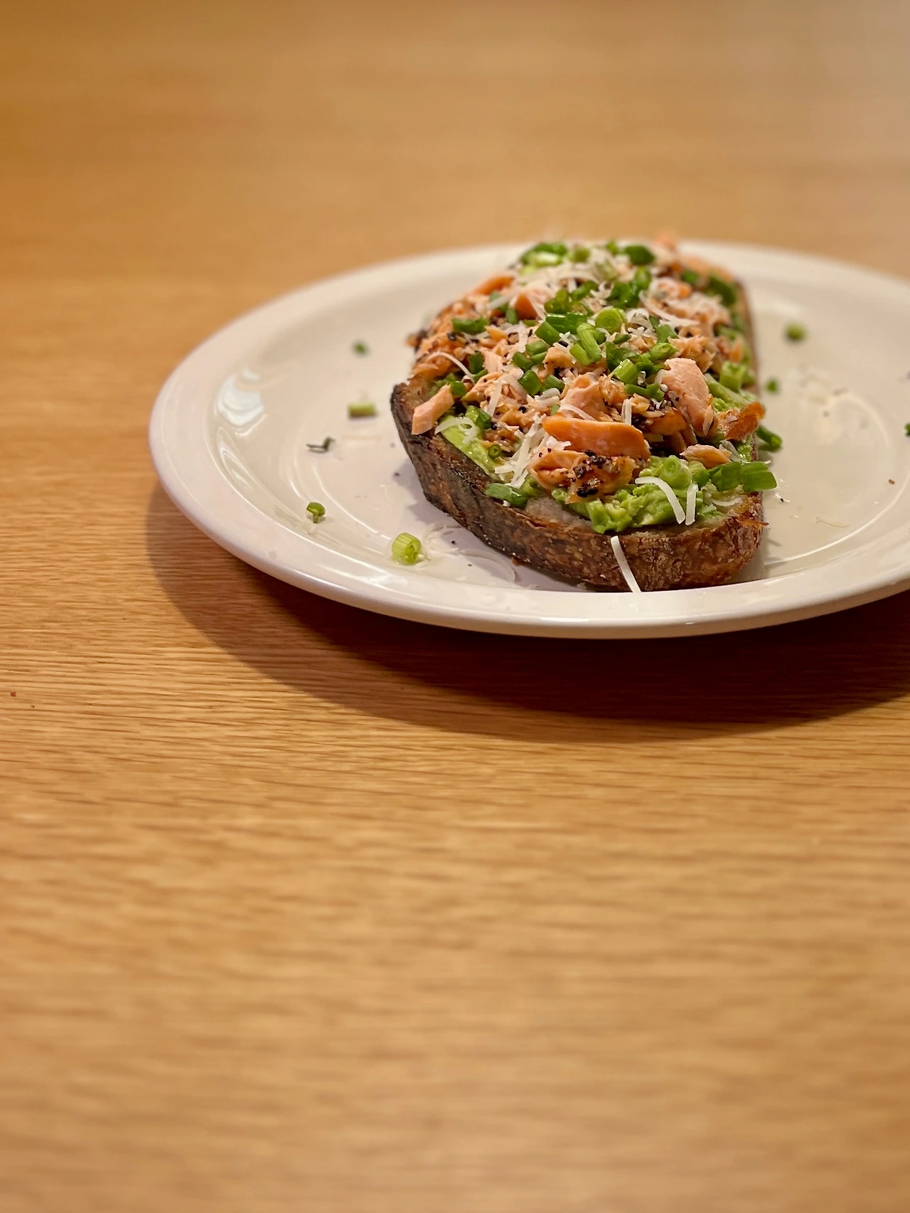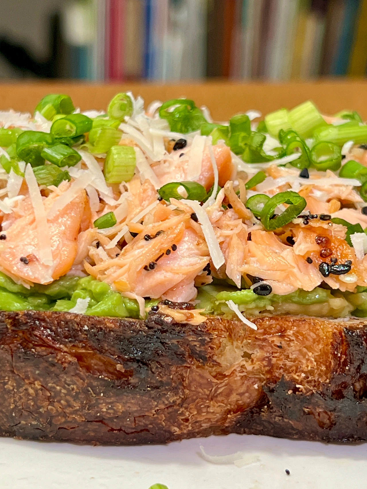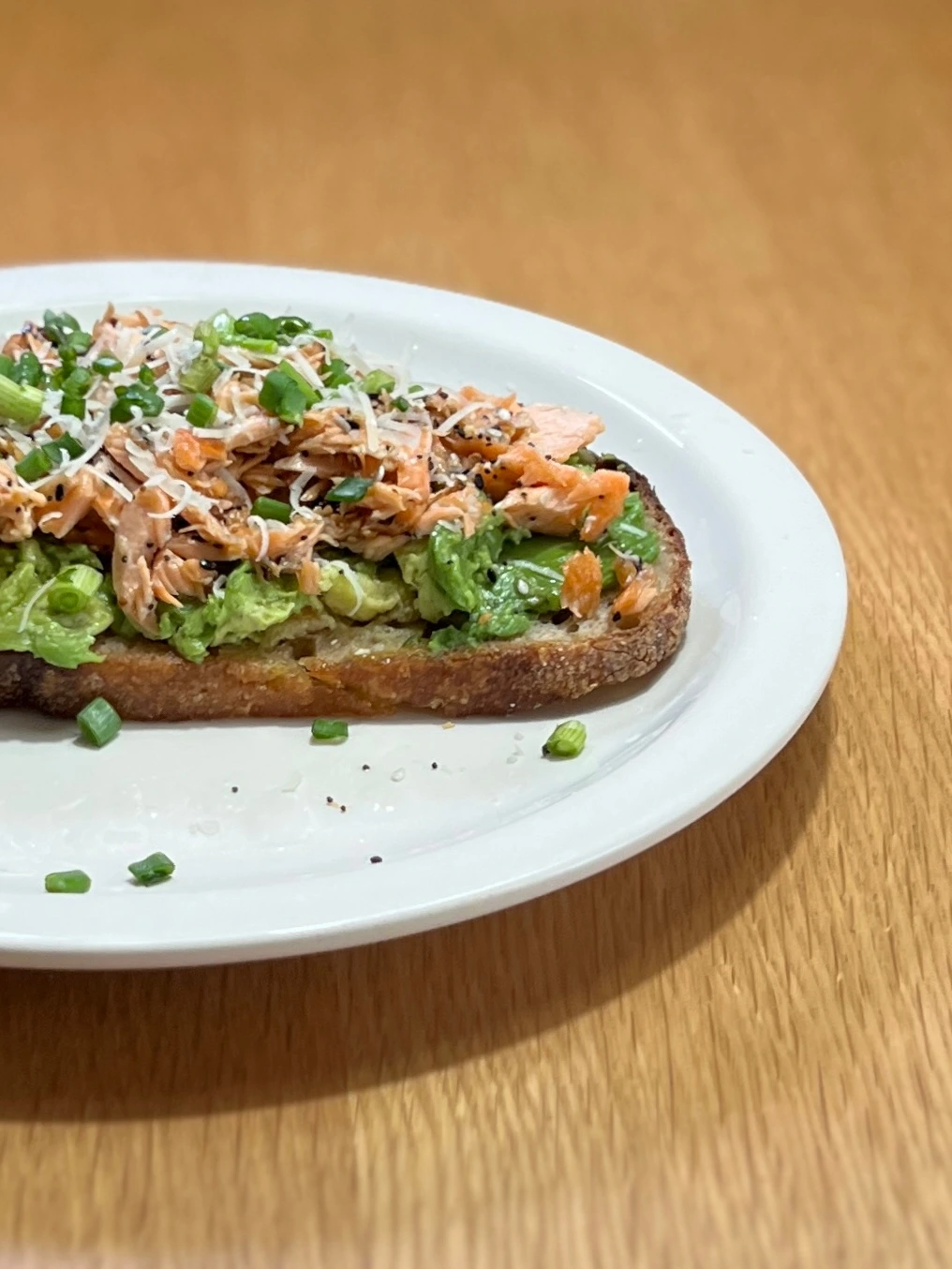 사워도우 1장, 연어 100g, 아보카도 1개, 다진 쪽파와 파마산치즈 조금, 에브리띵 베이글 세서미 시즈닝 2T, 올리브오일 조금