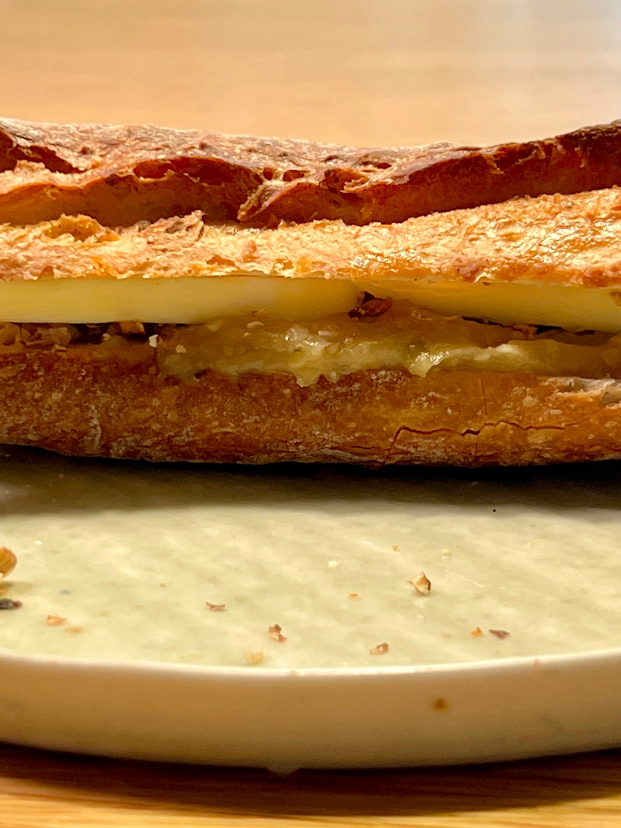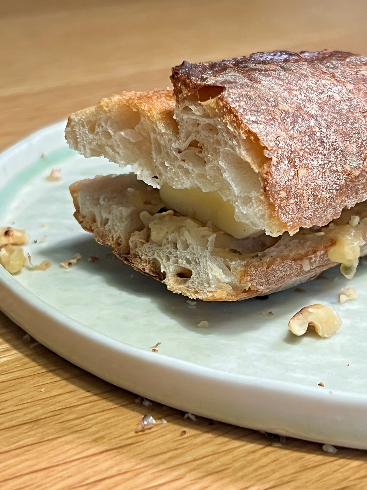 6. 바게트를 반으로 가른 후 한쪽 면에는 버터, 반대쪽 면에는 밤 페이스 바른다. 팬에 호두 살짝 구워서 얹고