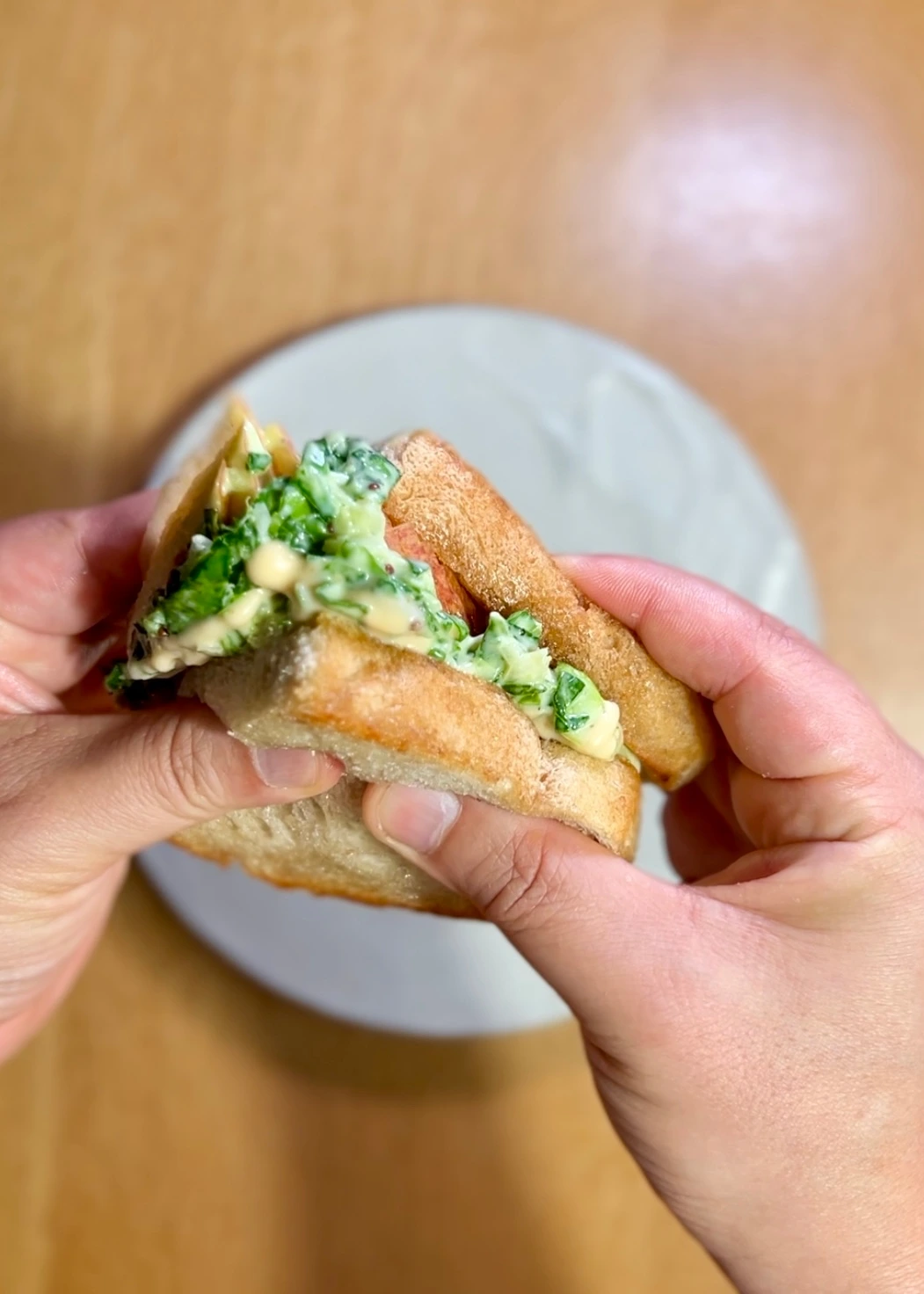 3. 접시에 바삭하게 구운 호밀통밀 브레드, 얇게 썬 사과, 2의 봄동샐러드 얹고 다시 호밀통밀 브레드로 덮는다.