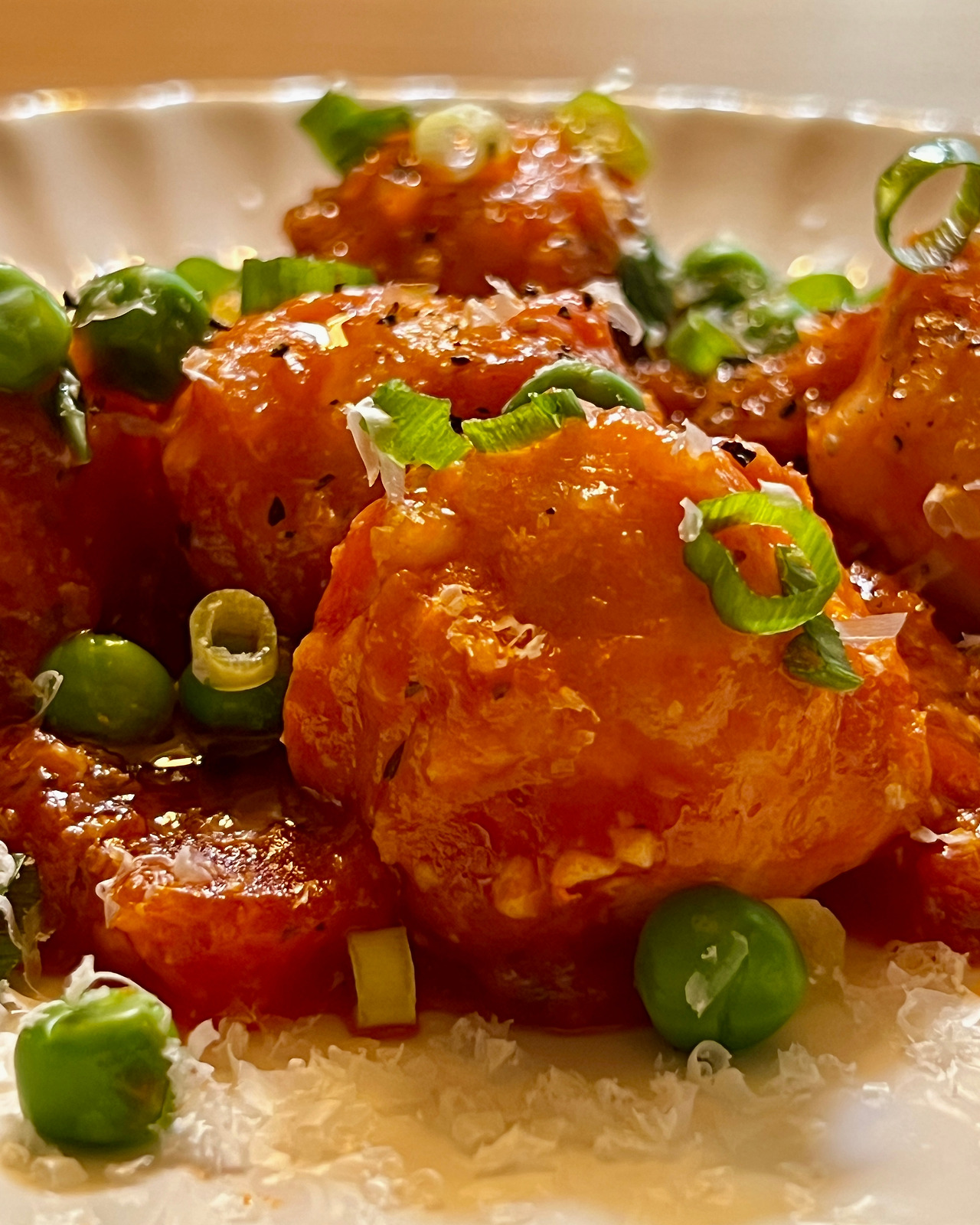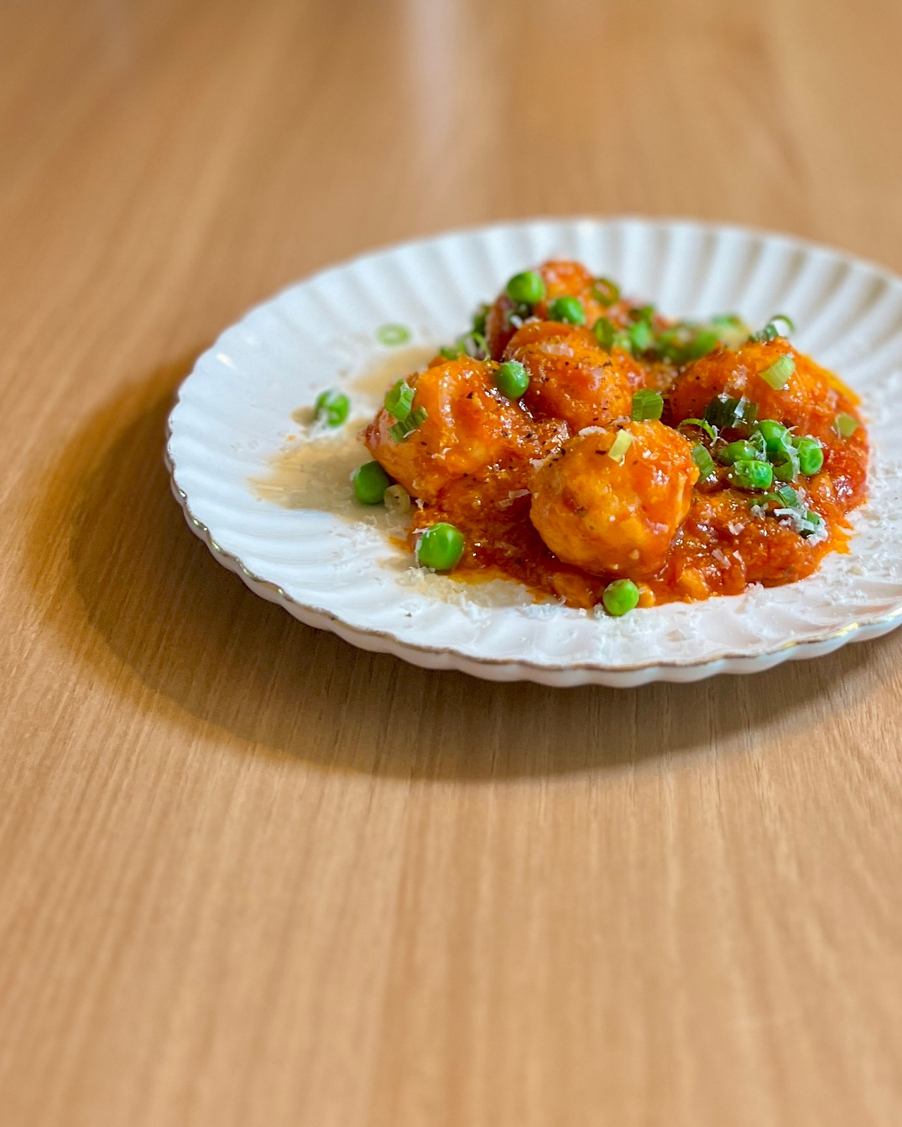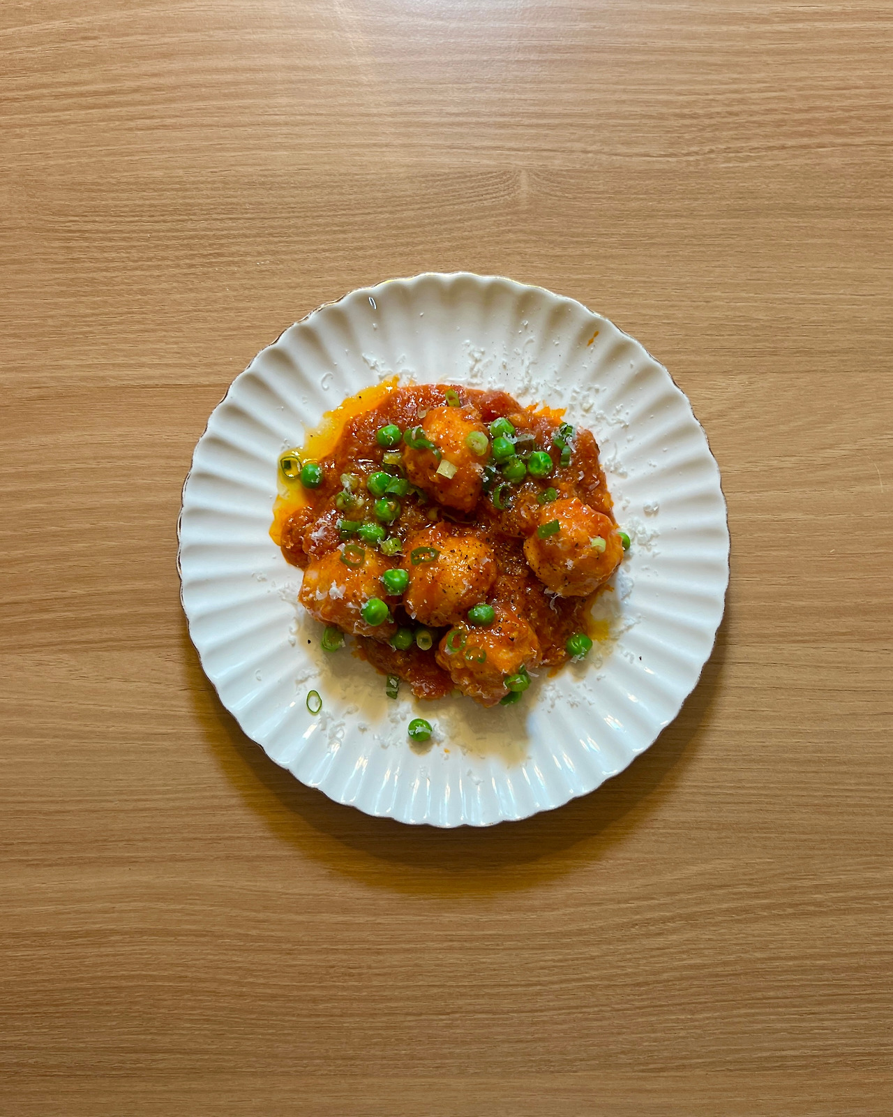 쉬림프 피시 볼 5개, 다진 마늘 1t, 토마토소스 4T, 완두콩 1/4컵, 그라나파다노치즈 조금, 올리브오일, 후추