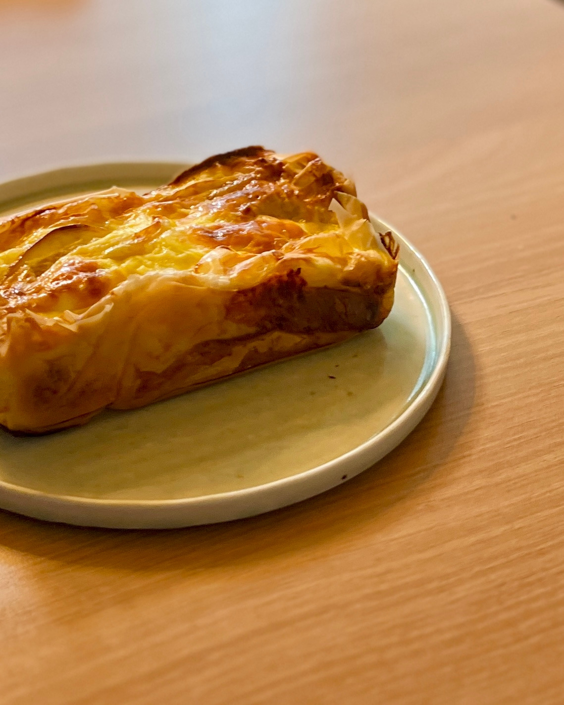 2. 사과 1/2개과 브리치즈 얇게 썰어 필로 도우 사이사이에 끼워 넣는다.