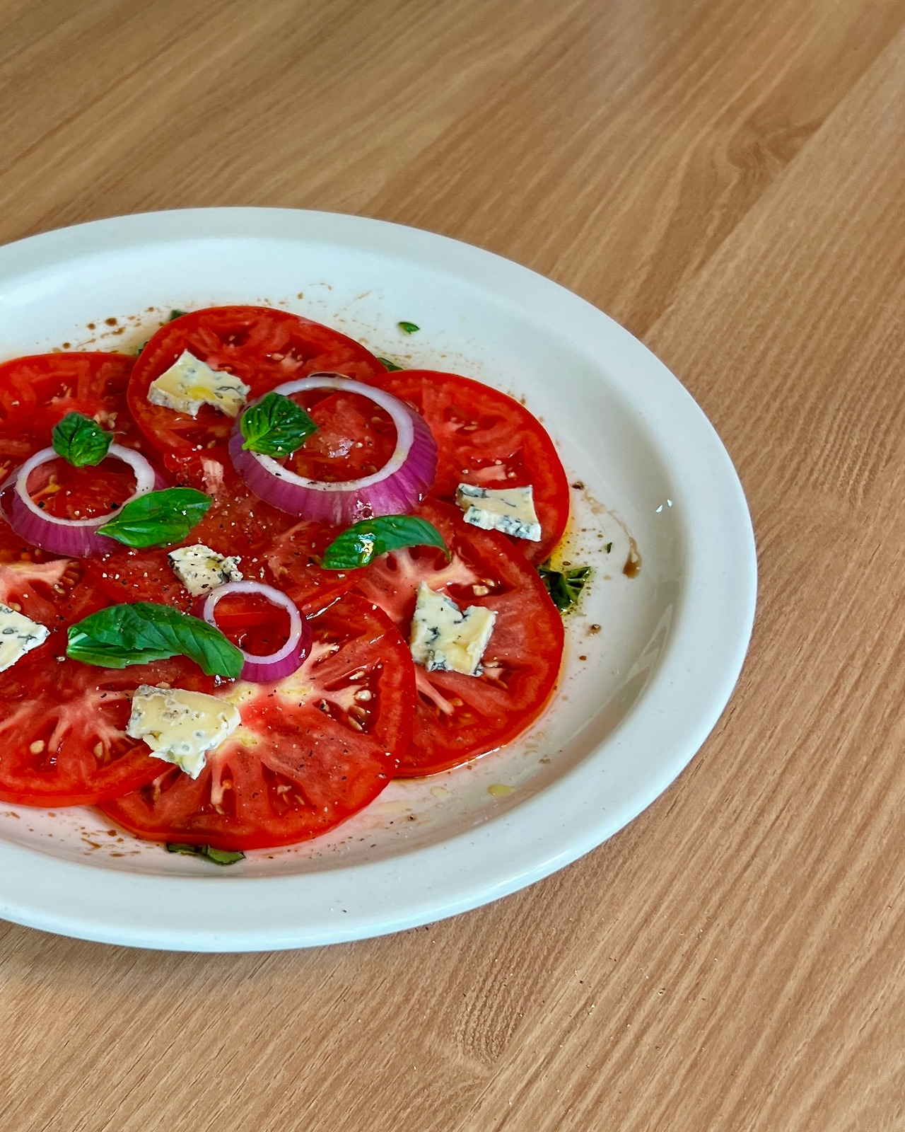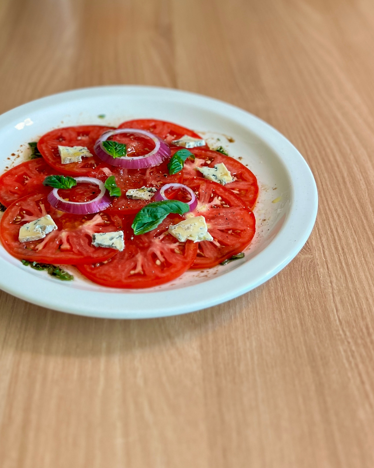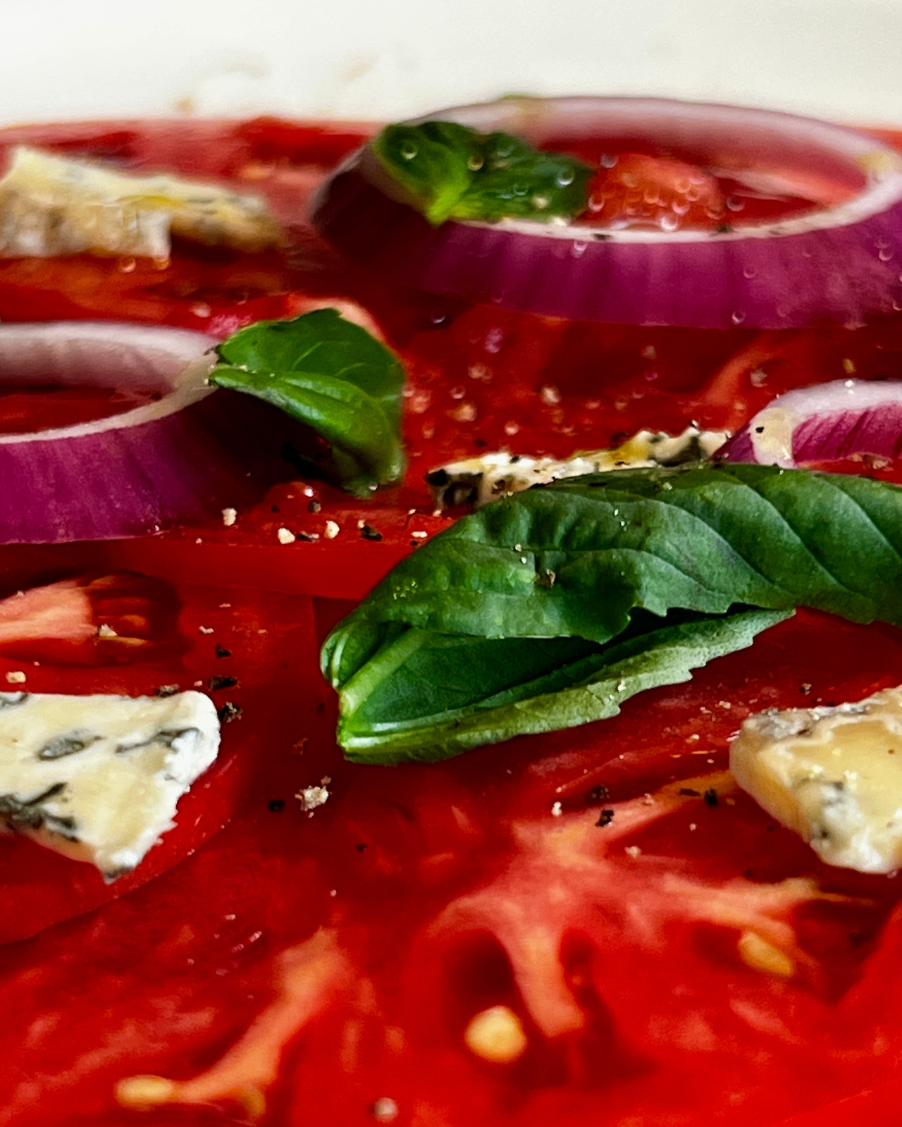 4. 얇게 썬 토마토를 드레싱 위에 얹고 적양파, 블루치즈, 바질 얹는다. 올리브오일, 후추로 마무리,