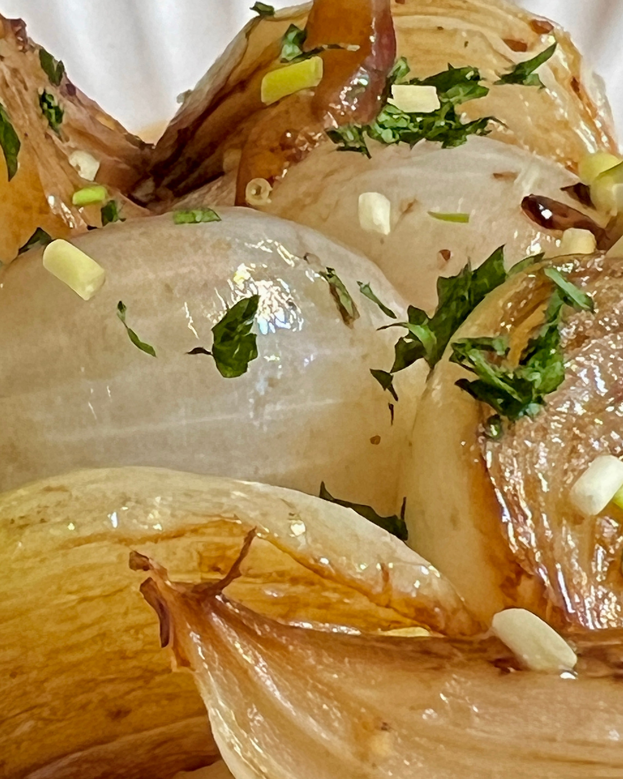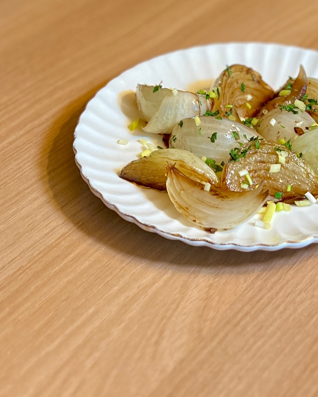 양파 2개, 버터 10g, 쪽파와 파슬리 조금, (드레싱) 간장 3T, 화이트와인 비니거 1T, 다진 마늘 1t