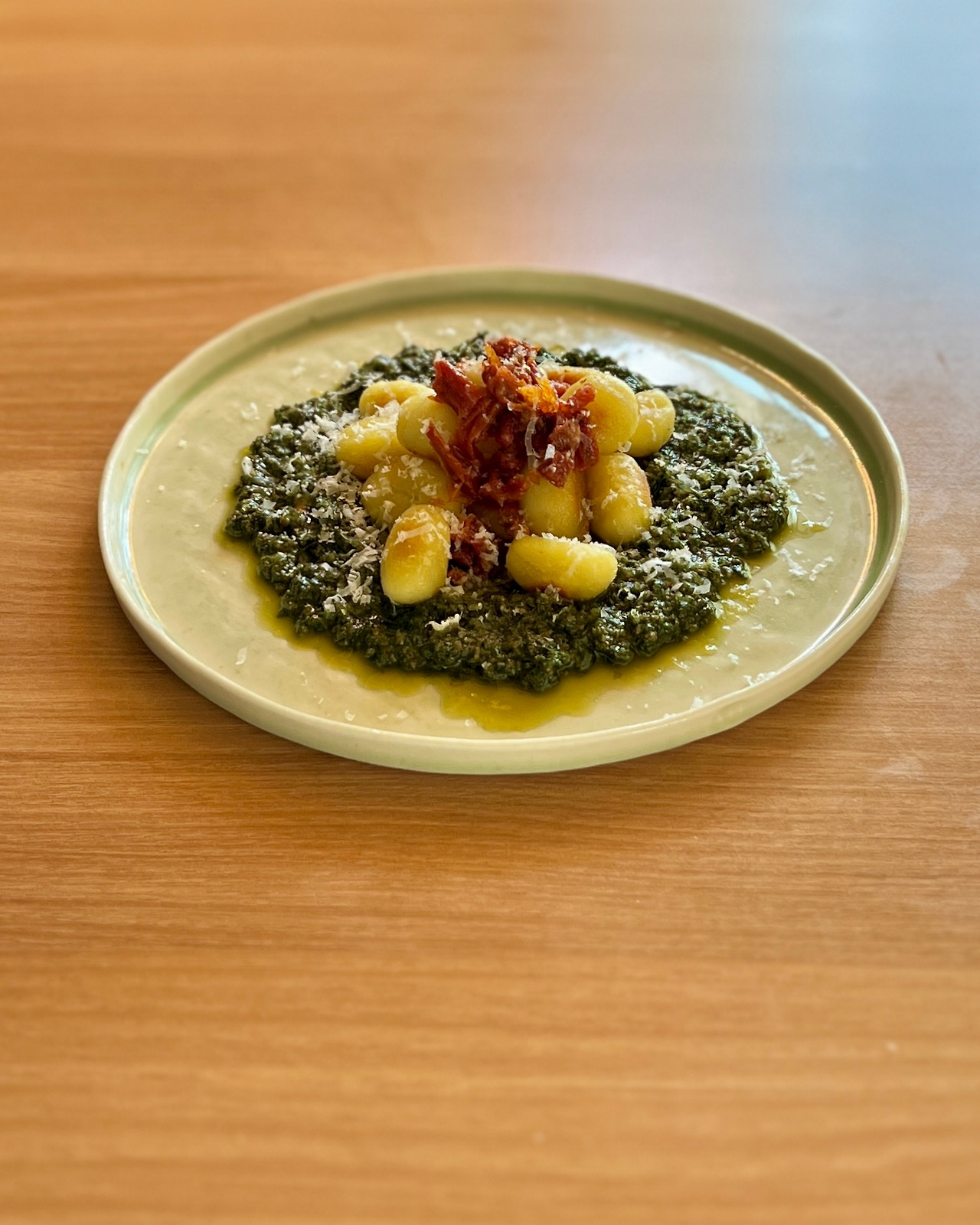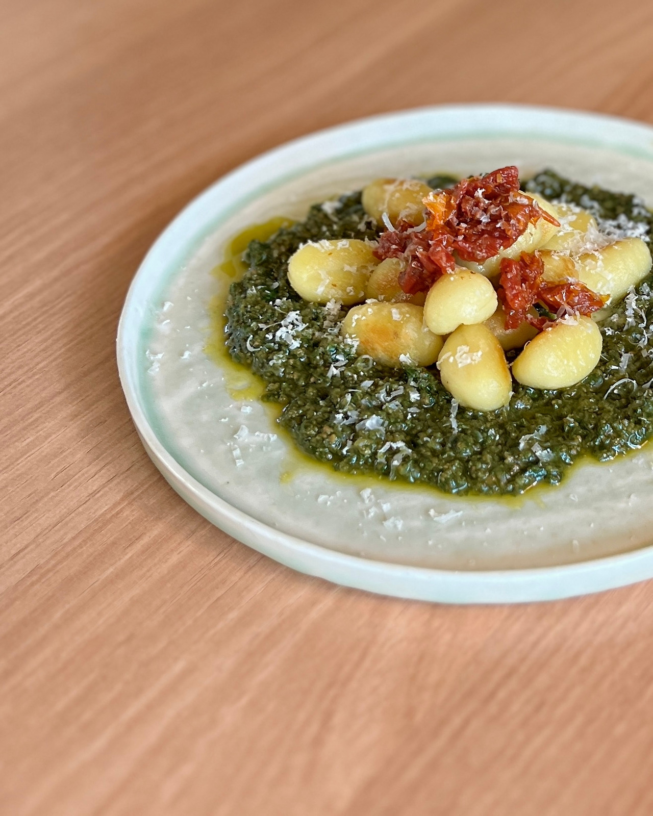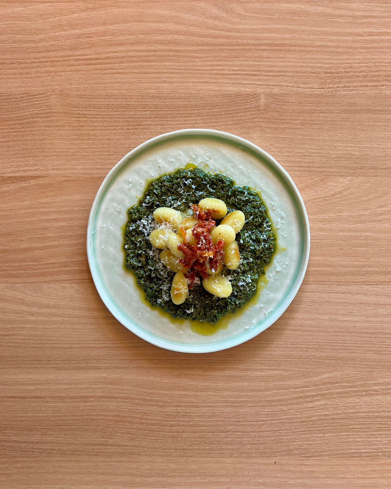 3. 접시에 바질페스토 담고 뇨끼 얹는다.