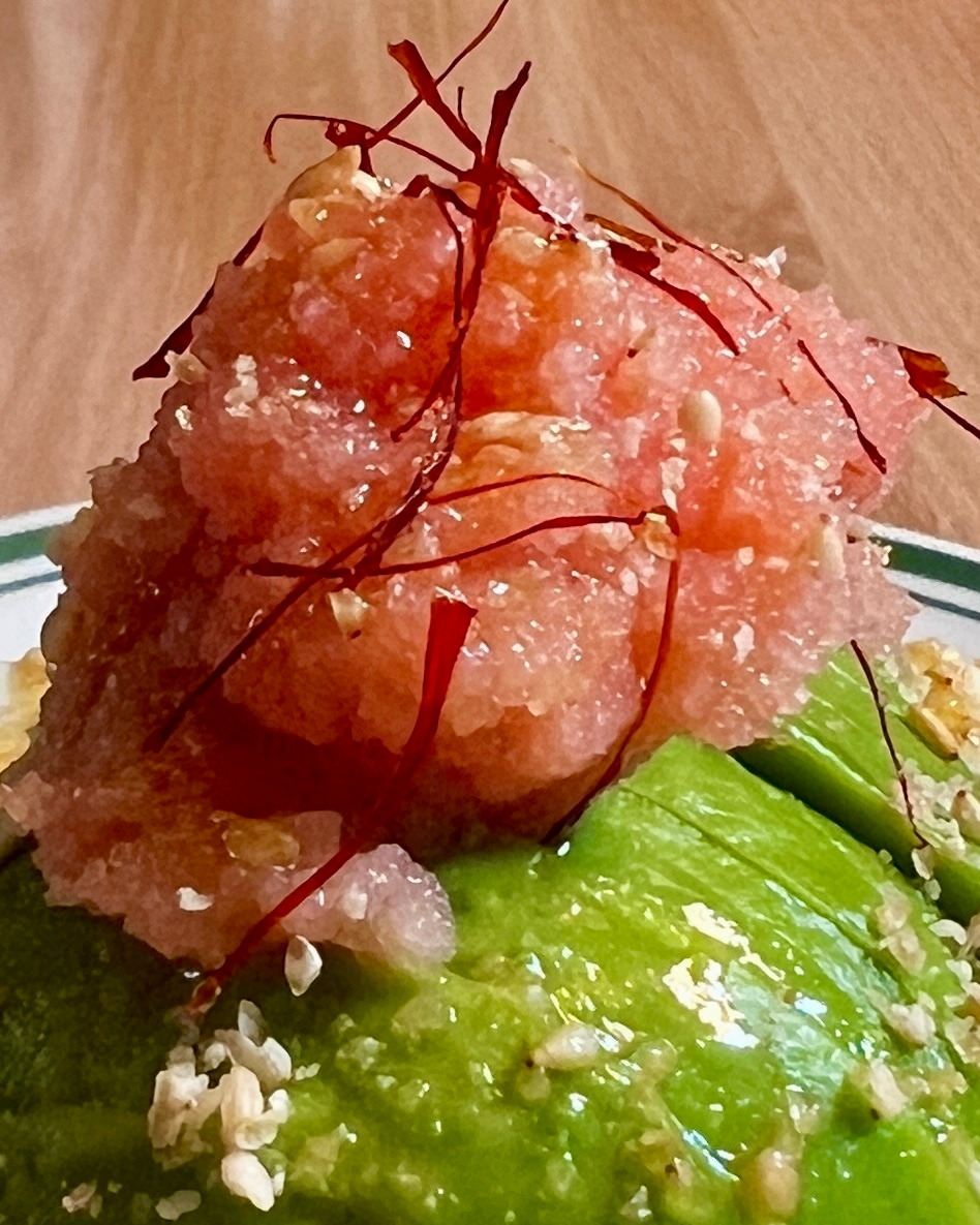 들기름에 샤프론을 우려내고 명란 위에 부어 백만 배쯤 풍미를 더한 약 485kcal 전두부 명란 아보카도 샐러드