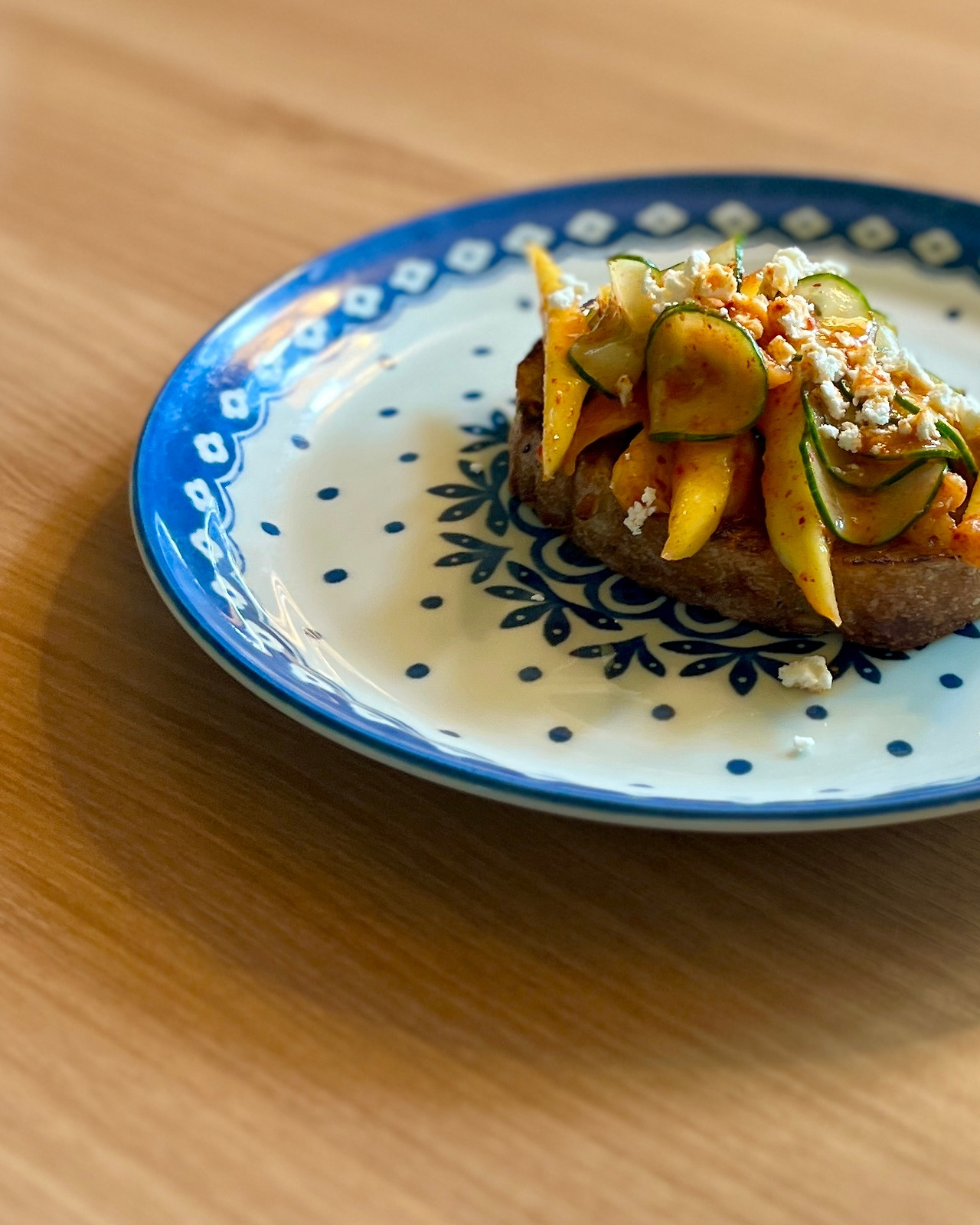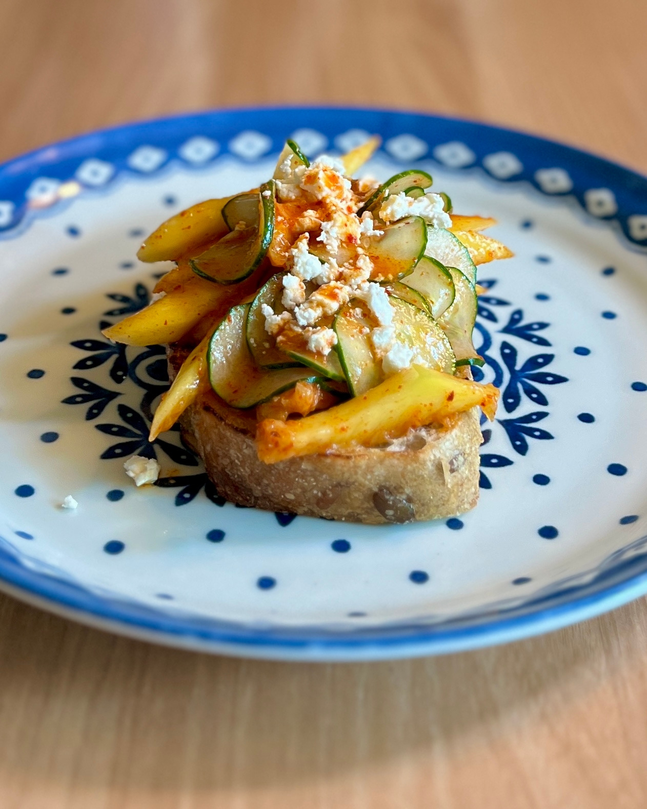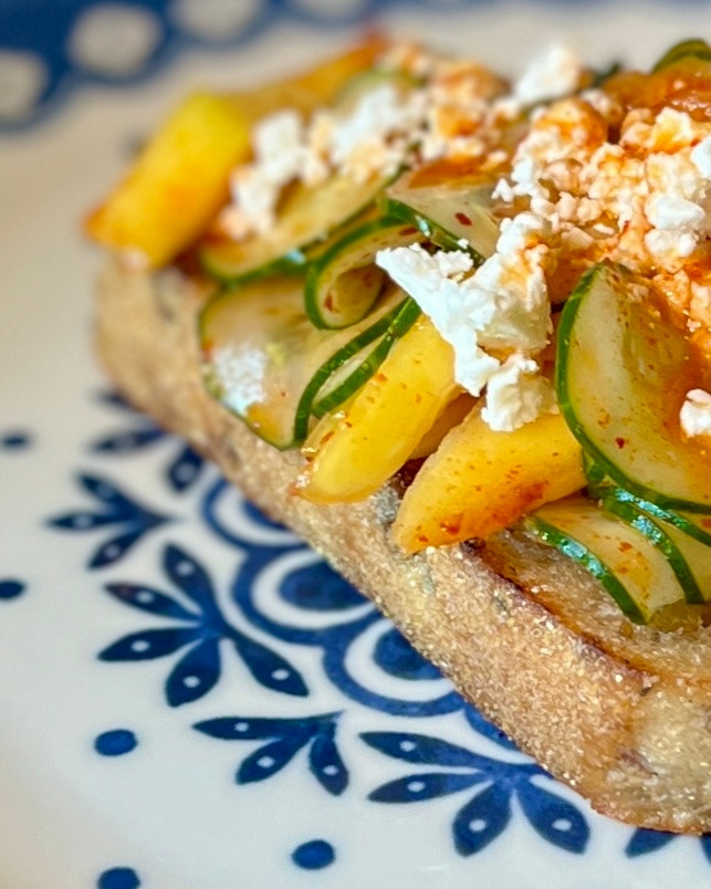 타힌 시즈닝이 없어서 고춧가루와 소금을 섞고 라임주스로 맛을 낸, 호불호가 뚜렷한 약 552kcal 오이 망고 토스트