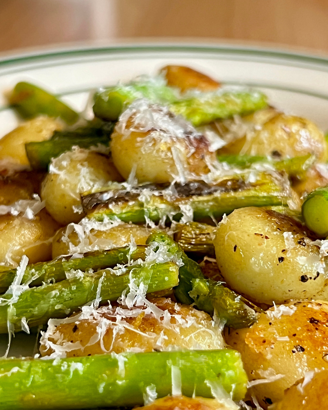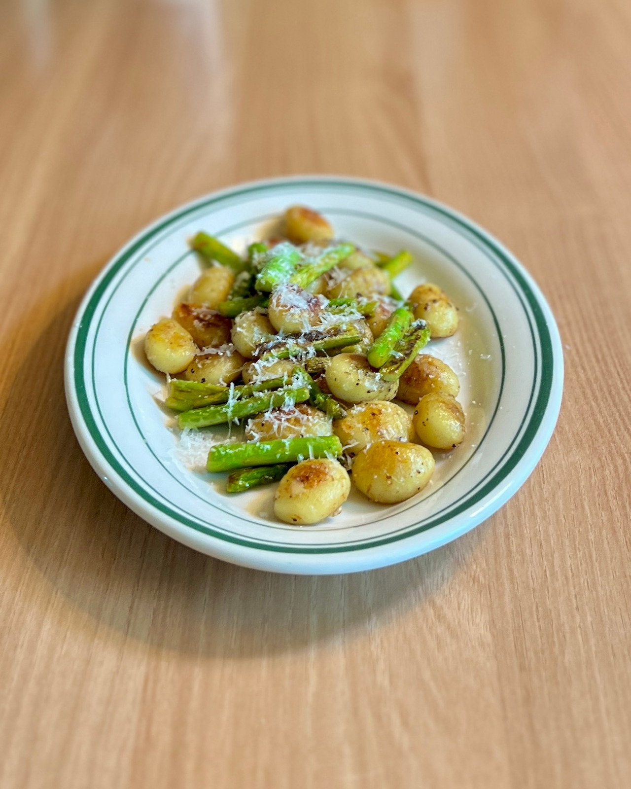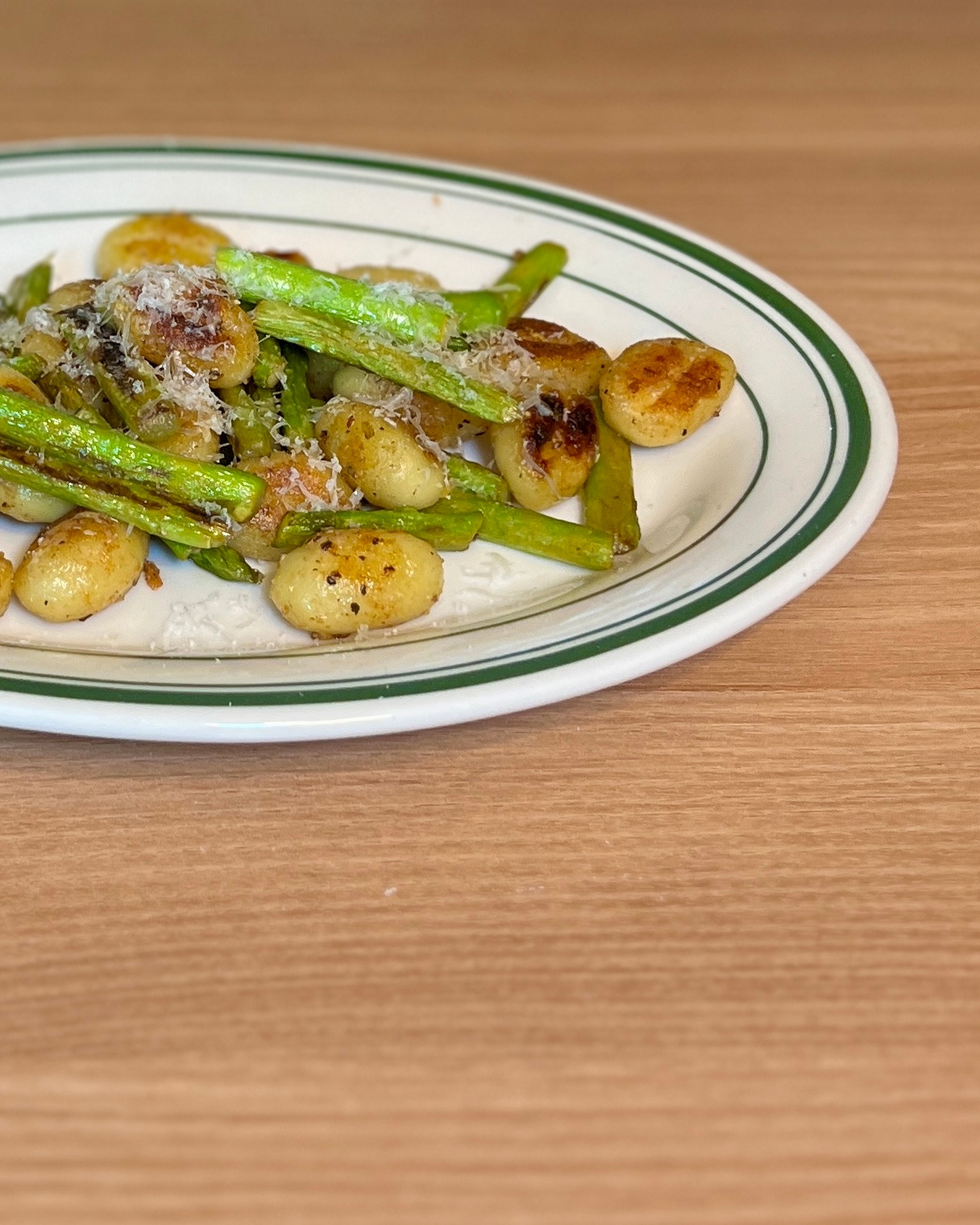 5. 접시에 뇨끼와 아스파라거스 담은 뒤 그라나파다노 치즈 얹는다.