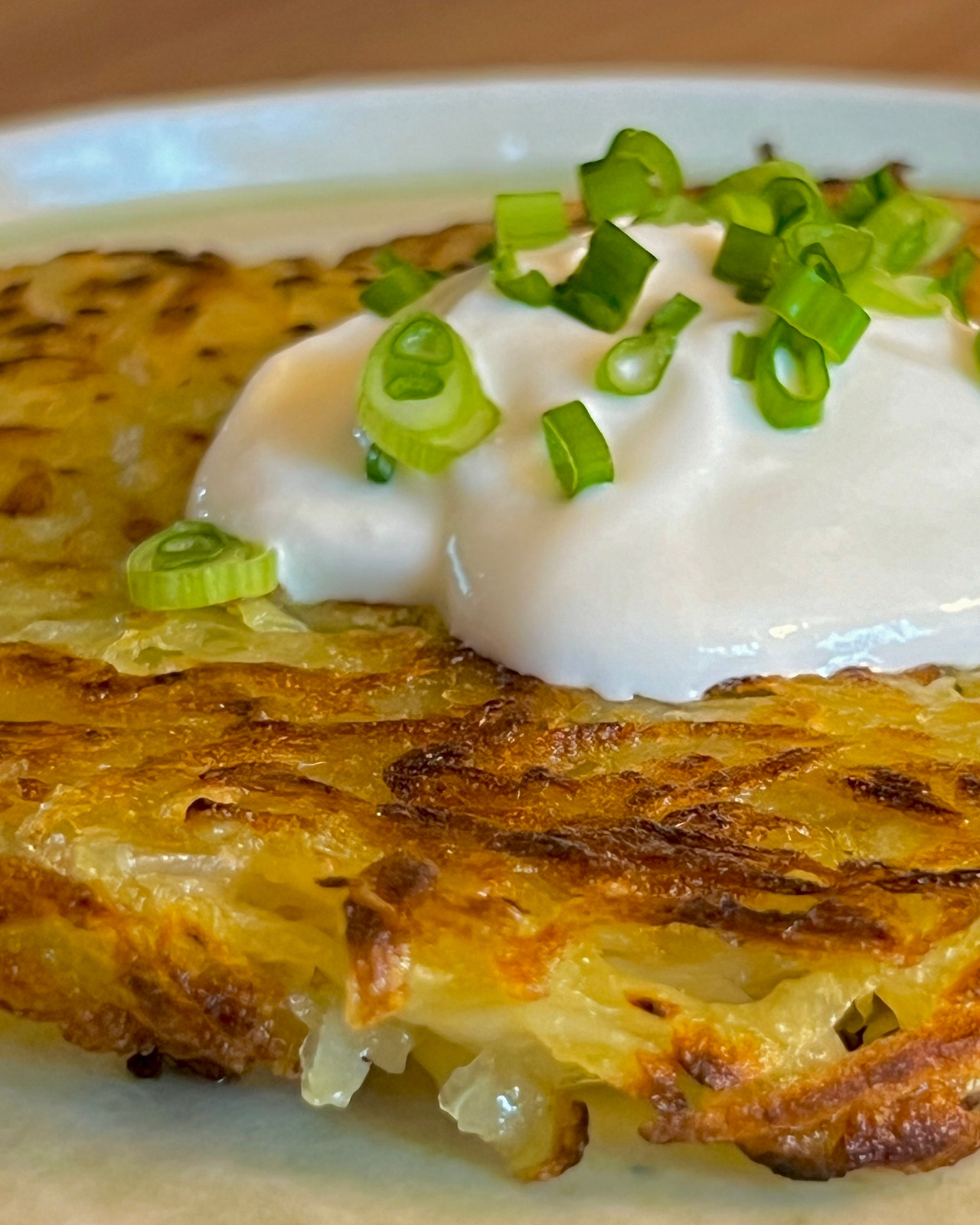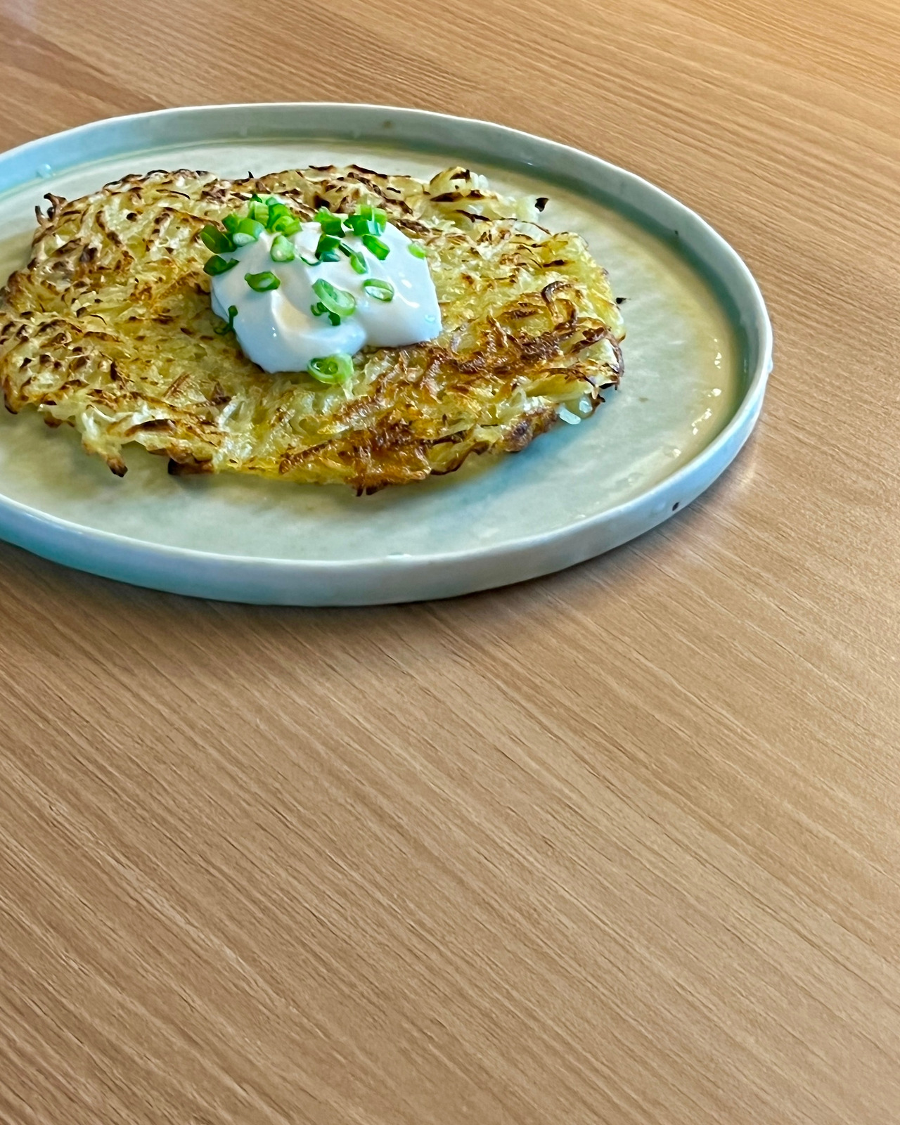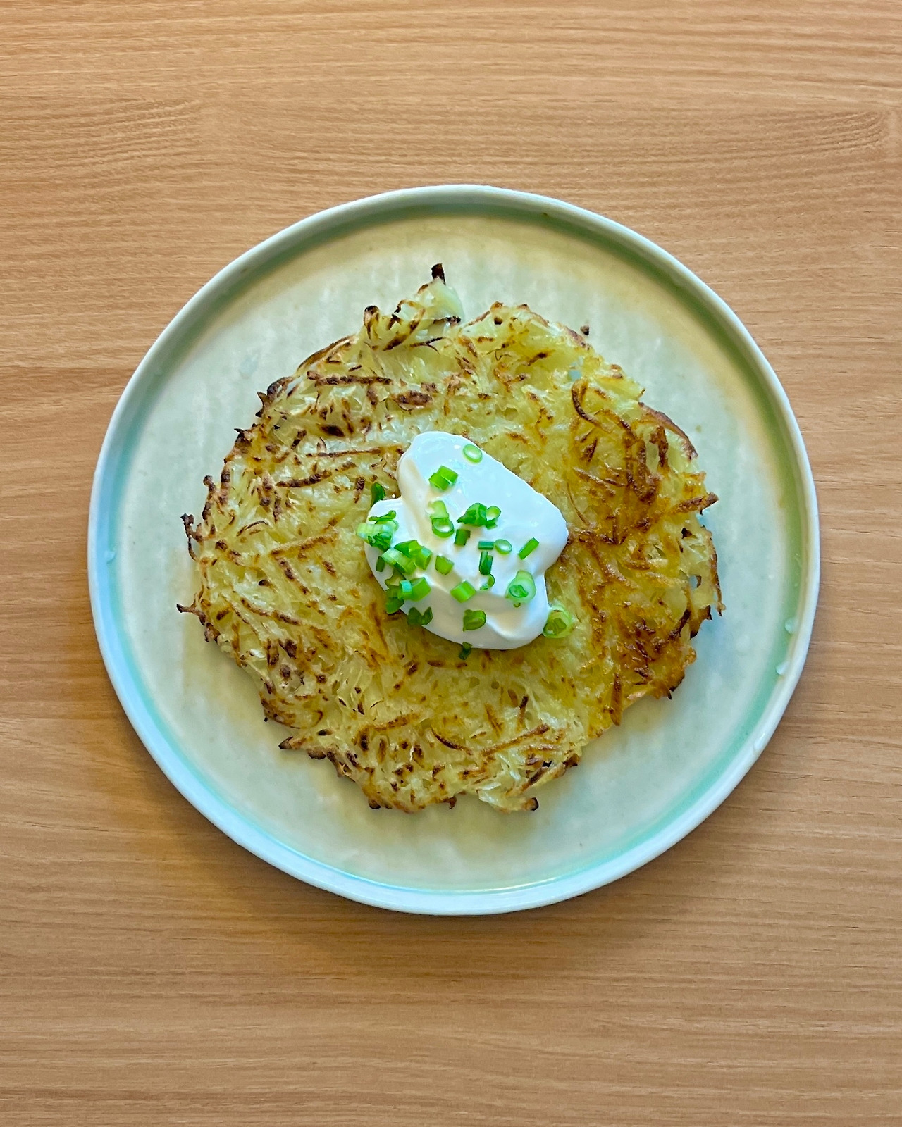 3. 2의 뢰스티를 접시에 담고 3의 그릭요거트를 뢰스티 위에 얹는다. 허전하니 쪽파도 조금 얹는다.