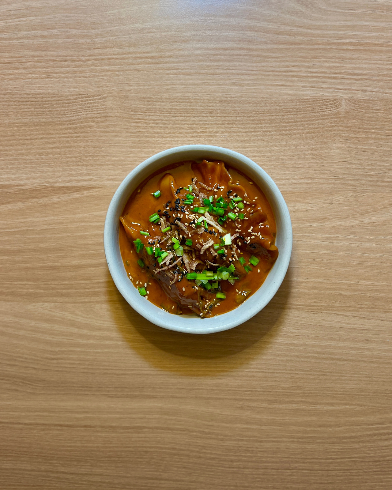 만두 5개, 청경채 한 줌, 다진 마늘 3개, 칠리 페이스트 1T, 토마토소스 2T, 고추장 3T, 간장 2T, 미소 1T, 식초 1T와 코코넛밀크 400ml
