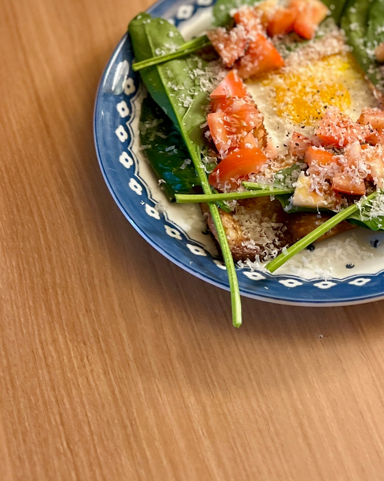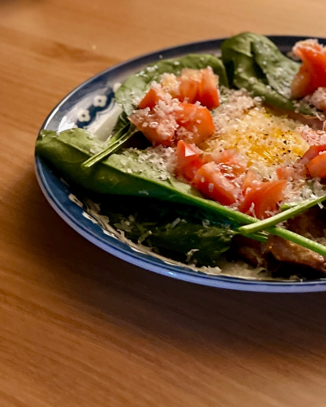 3. 접시에 담고 시금치, 토마토 얹고 파마산치즈 솔솔솔~
