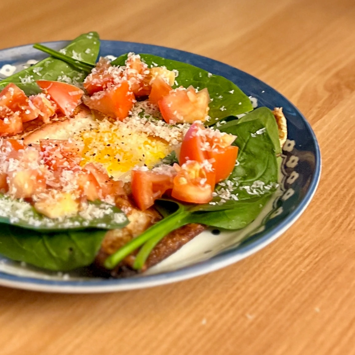 시판 크레페 1장, 토마토 1개, 콩으로 만든 슬라이스 햄, 계란 1개, 시금치 조금, 파마산 치즈, 올리브오일