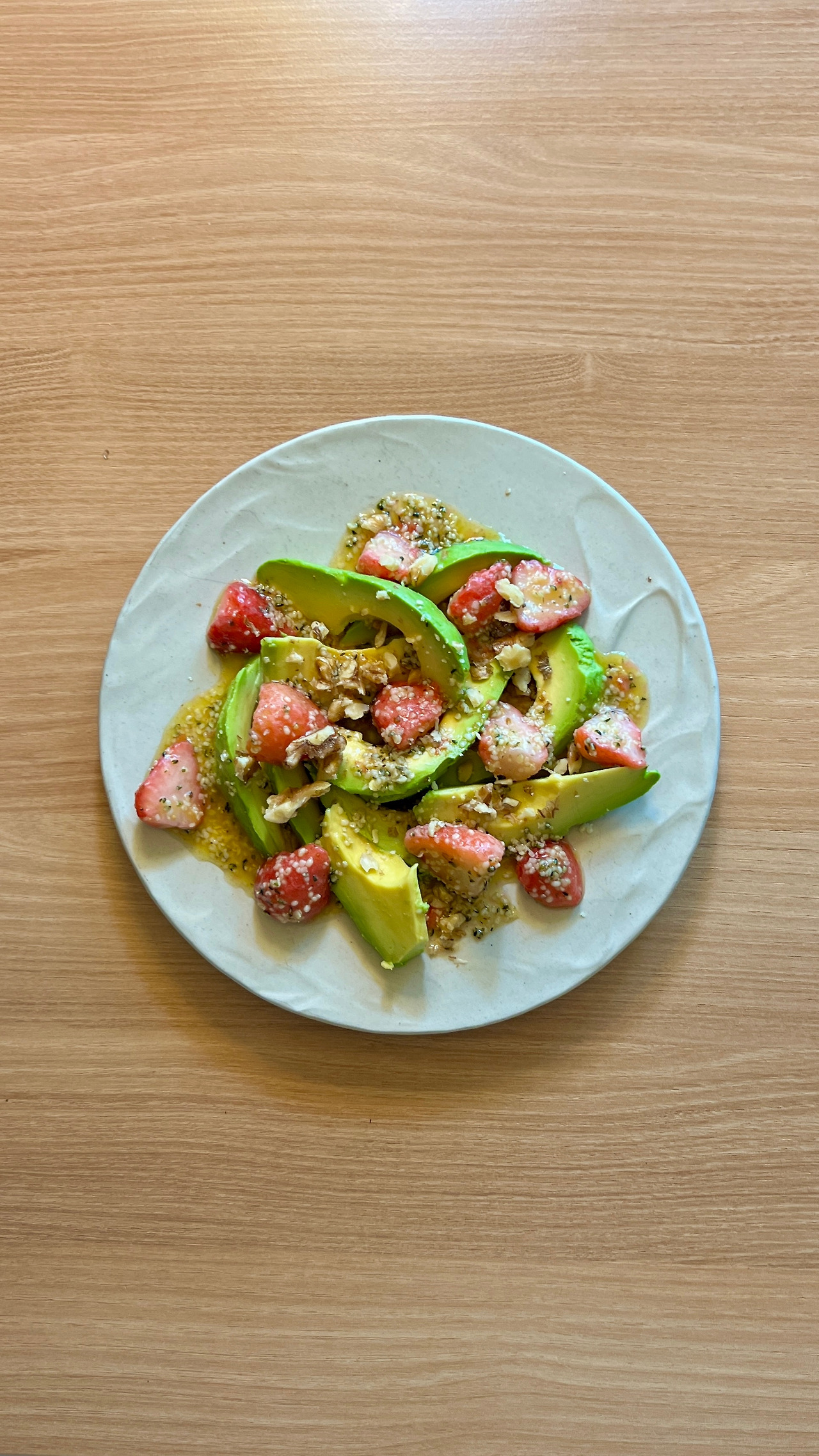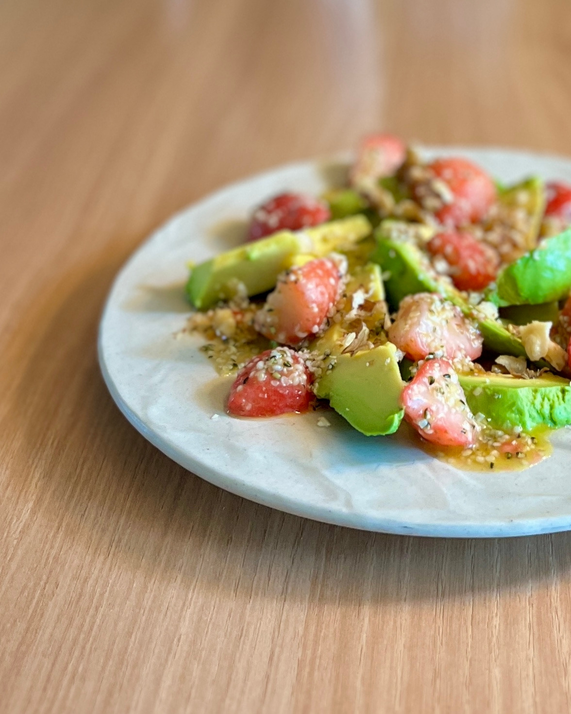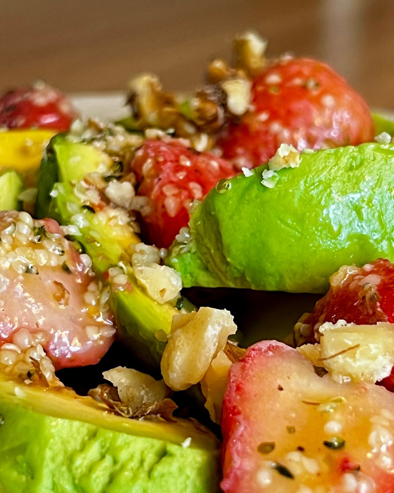 아보카도 1개, 냉동 딸기 1컵, 호두 1T, (드레싱) 올리브오일 3T, 레몬주스 2T, 햄프시드 1T, 꿀과 소금, 후추