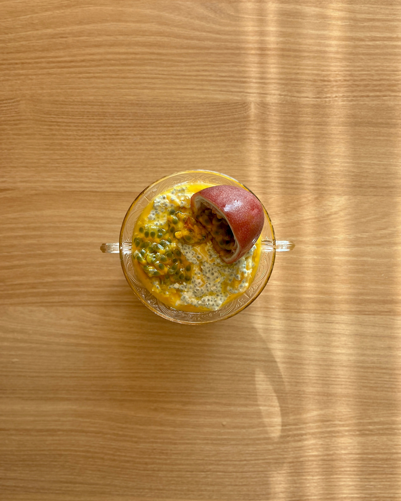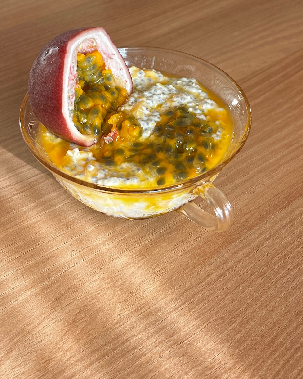 오트밀 1컵, 치아시드 2t, 우유 1컵, 그릭요거트 1컵, 잘게 썬 망고 6T, 메이플시럽 1T, 바닐라 익스트랙트 1t, 소금 한 꼬집, 패션후르츠 2개