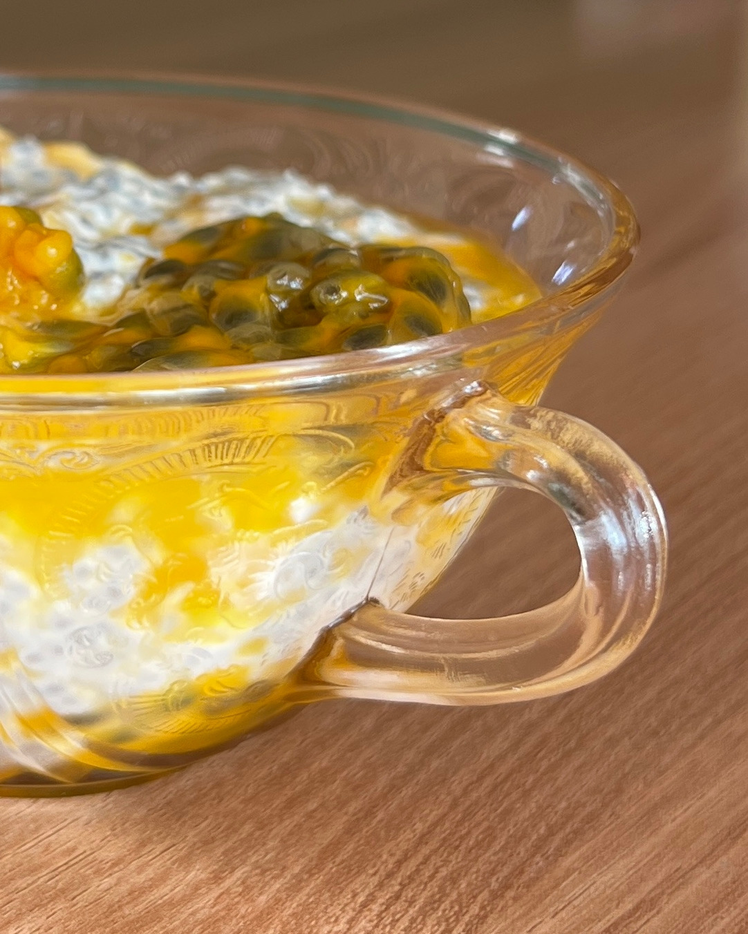 2. 그릇에 패션후르츠 1개 과육 넣고 1의 오트밀 붓는다. 1개 과육은 위에 얹는다.