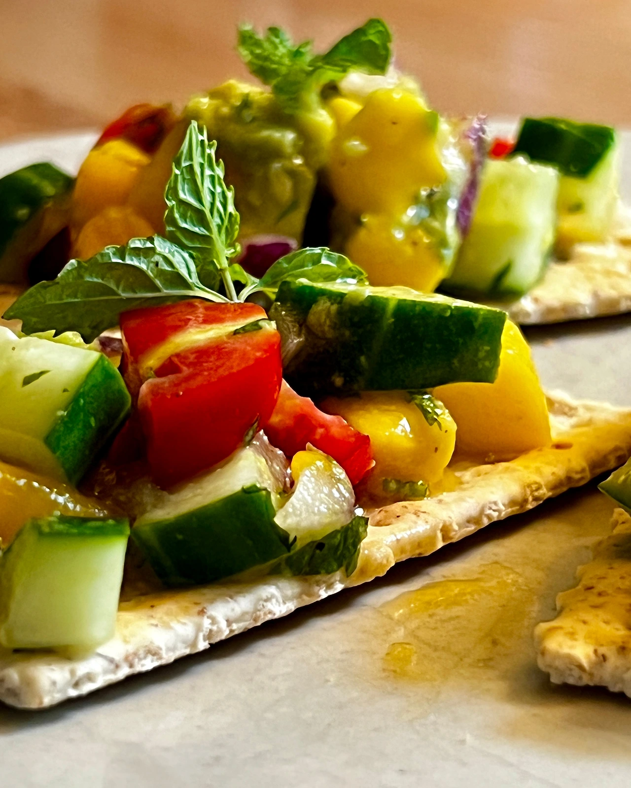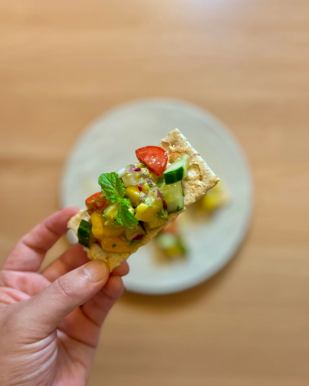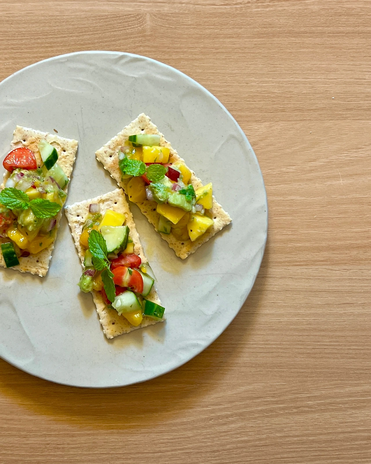 나른한 금요일 아침을 깨워 줄, 각 재료의 비율은 입맛대로, (호밀크래커 포함) 약 180kcal 망고 살사
