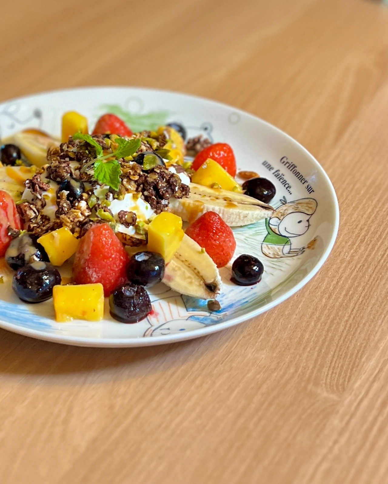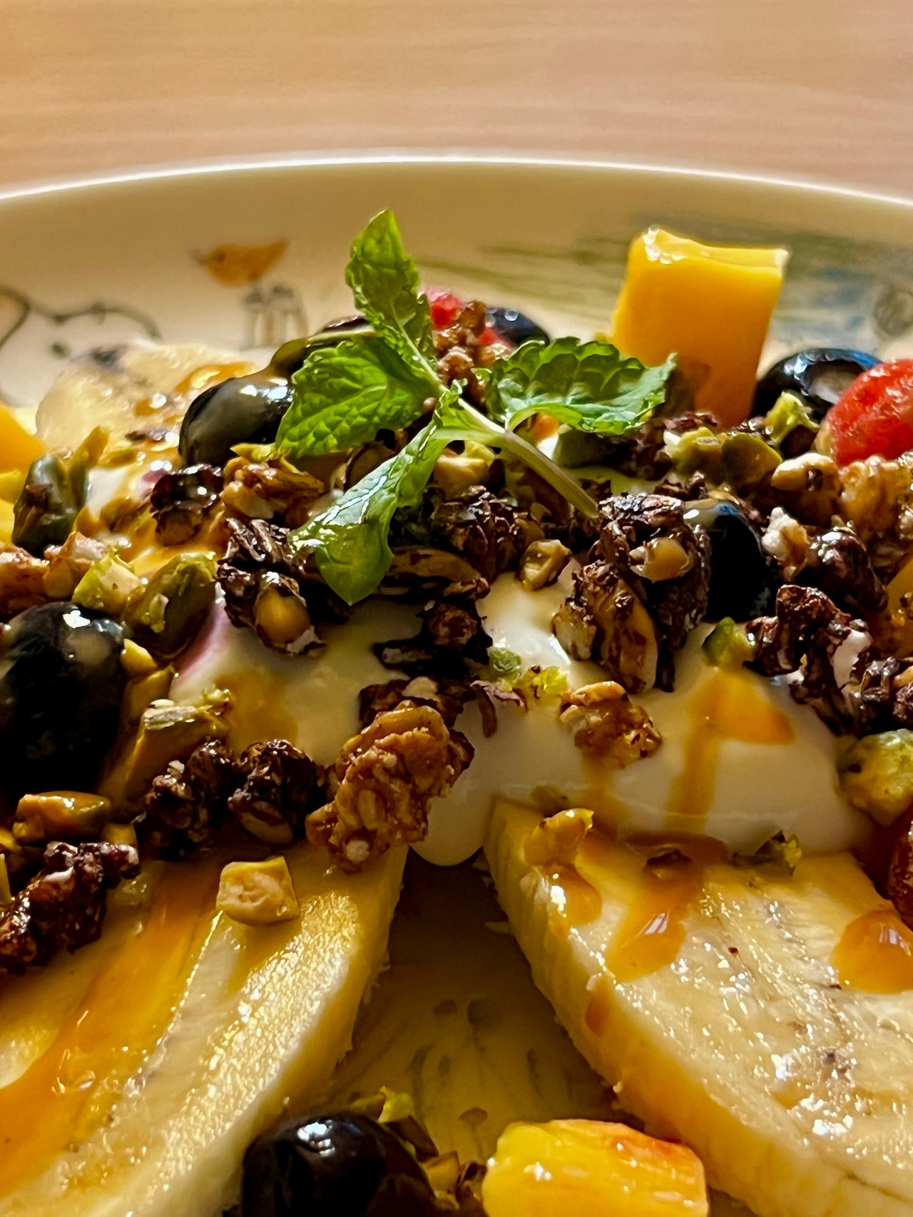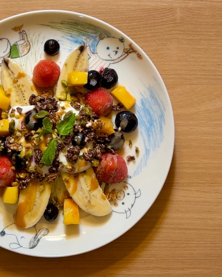 1. 바나나 반으로 썰어서 접시에 얹고 그릭요거트 듬뿍, 딸기, 망고, 블루베리, 그래놀라, 피스타치오 등 원하는 토핑 얹고 피넛버터로 마무리한다.
