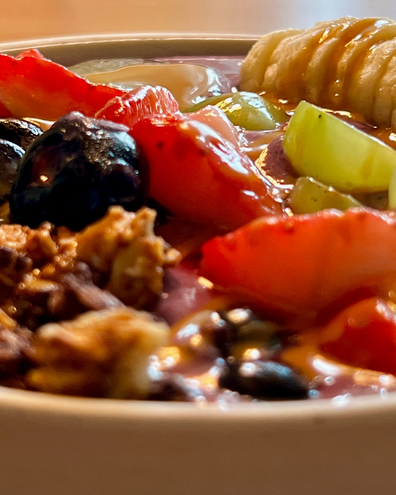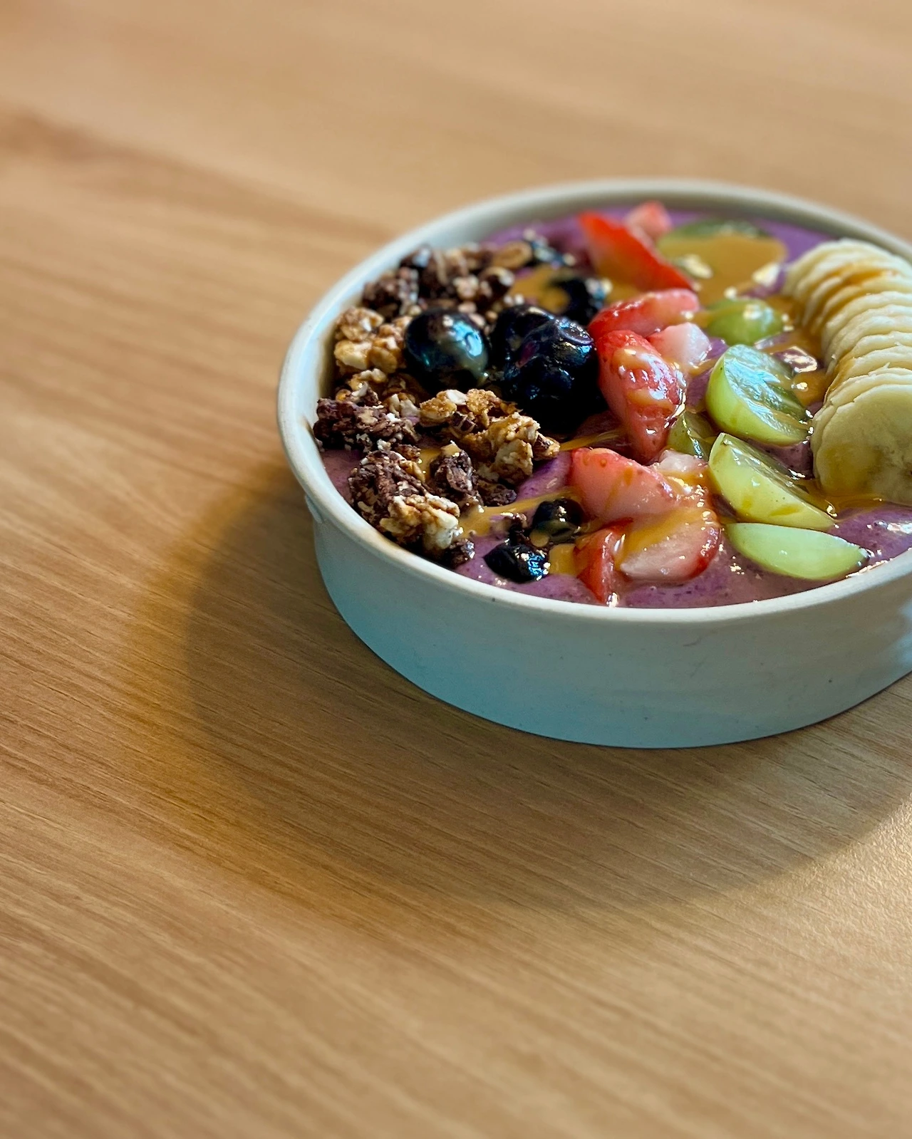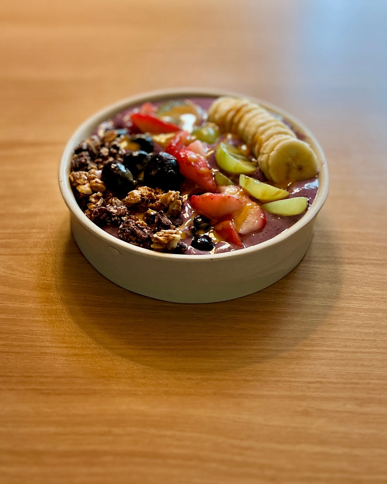(베이스) 그릭요거트 1/2컵, 아사이베리 파우더 1T, 바나나 1, 햄프시드 1t, 치아시드 1t, 호두 1t, (토핑) 그래놀라, (냉동) 블루베리와 딸기, 샤인머스캣, 바나나와 피넛버터 등 원하는 것은 무엇이든 토핑 할 수 있다.