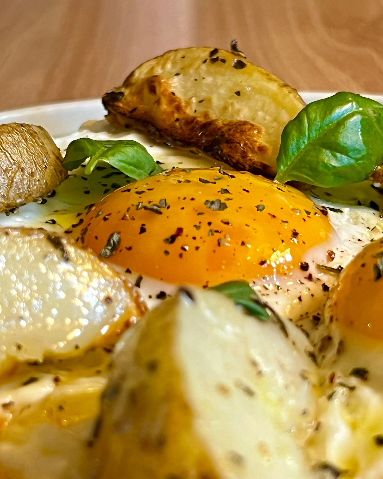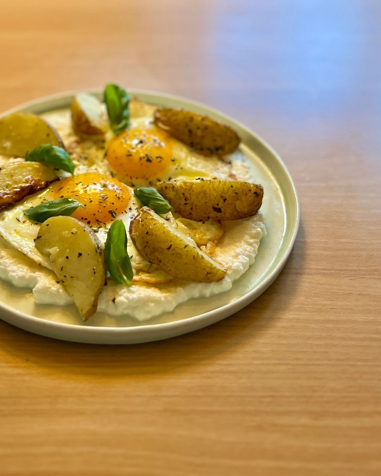 4. 접시에 2의 리코타치즈, 3의 계란 프라이, 1의 감자 얹고 바질 잎, 올리브오일로 마무리한다.