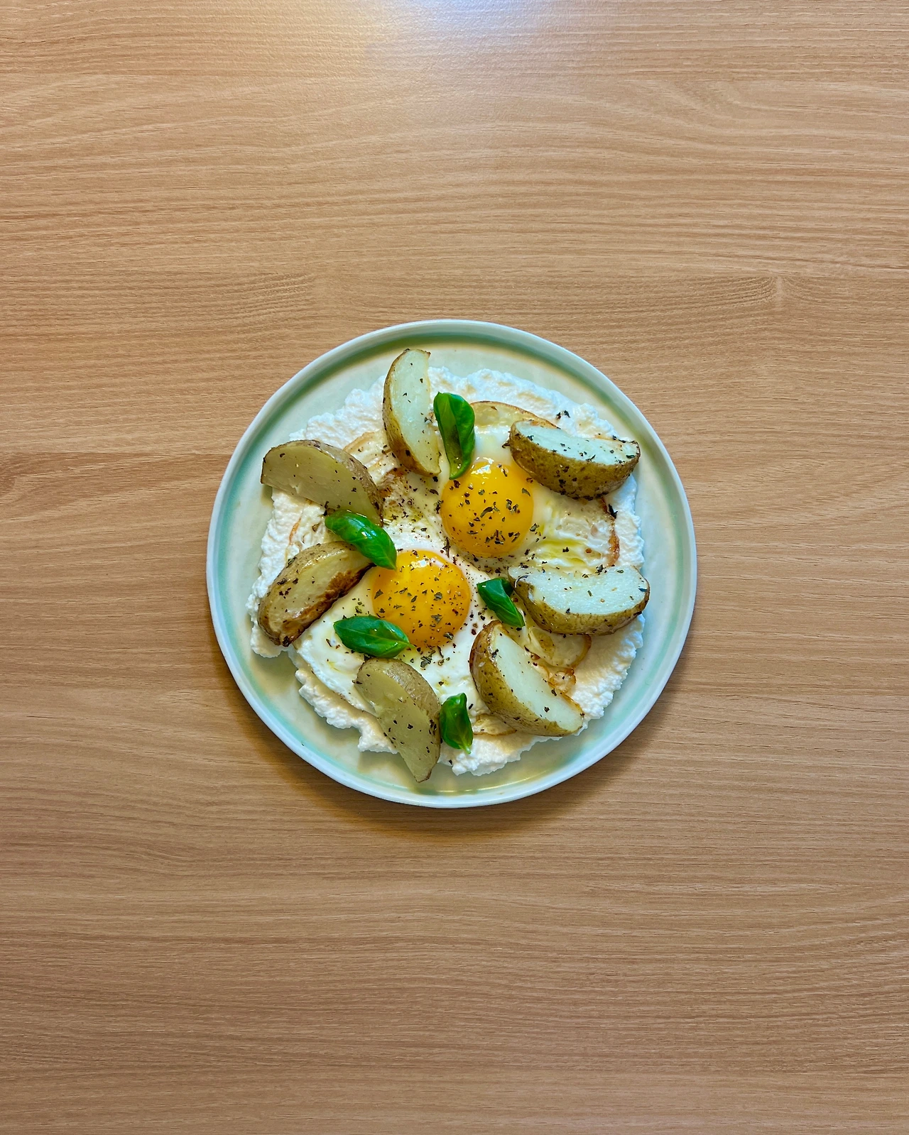 레몬주스로 상큼함을 더한 리코타치즈를 곁들인, 약 400kcal 써니사이드업 에그 앤 포테이토