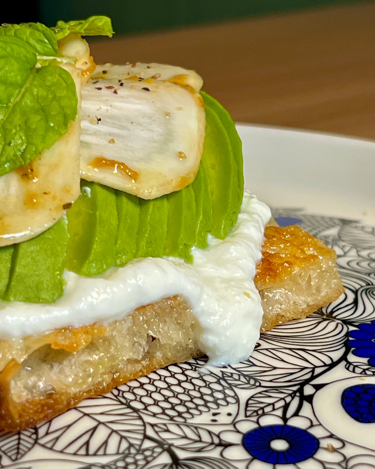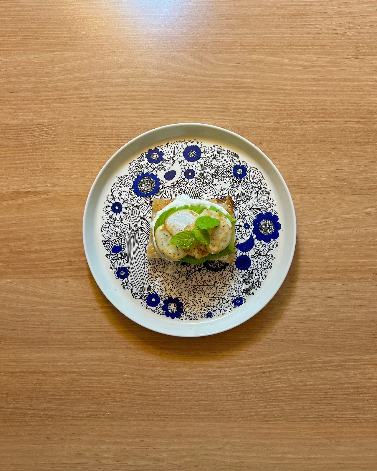 오늘은 숟가락이나 젓가락, 포크와 나이프를 버리고 기꺼이 전 세계 40%에 해당하는 수식 문화에 동참한다. 가볍게 손으로 들고 먹는, 타히니 드레싱에 마리네이드 한 순무를 곁들인, 약 500kcal 아보카도 리코타치즈 토스트
