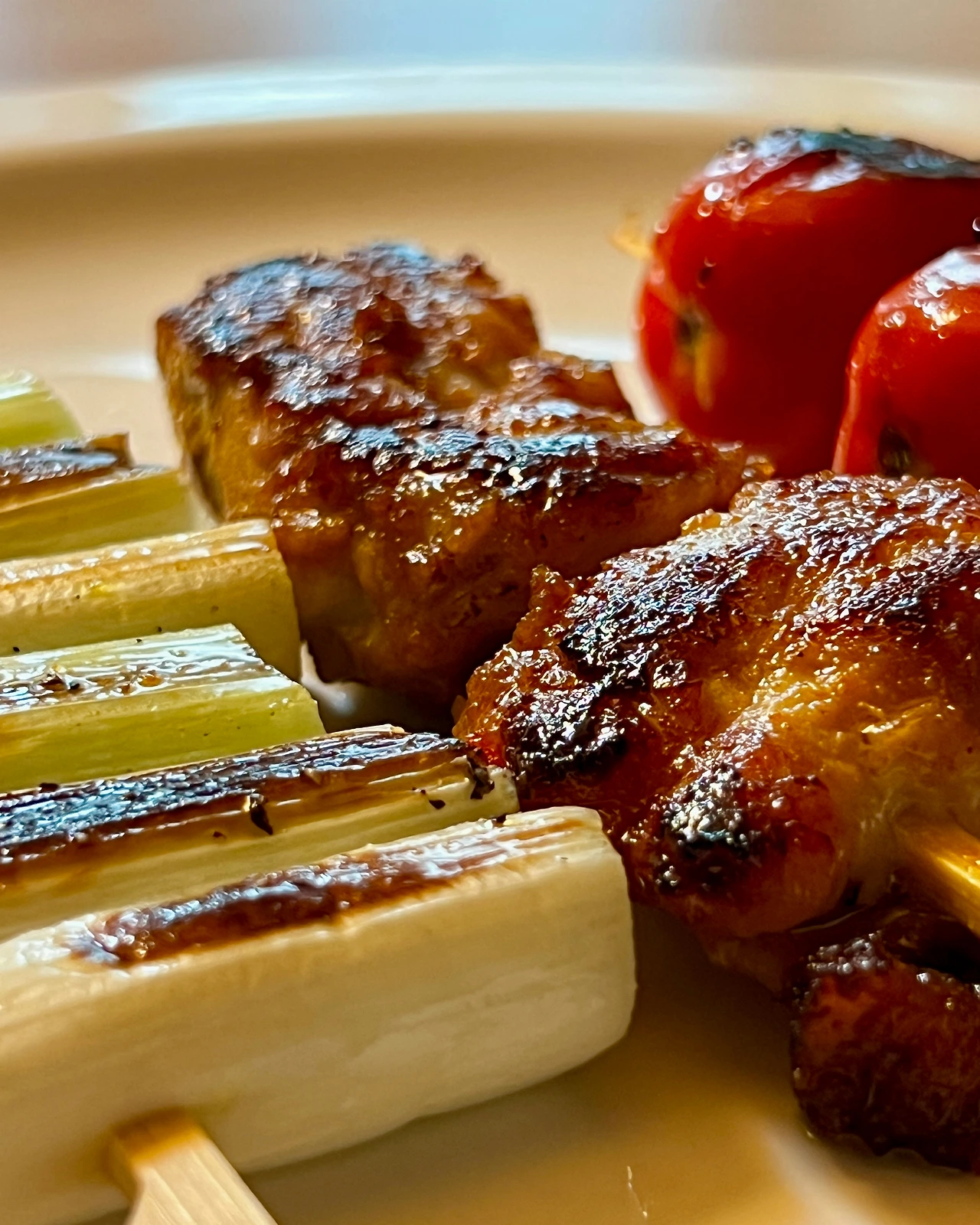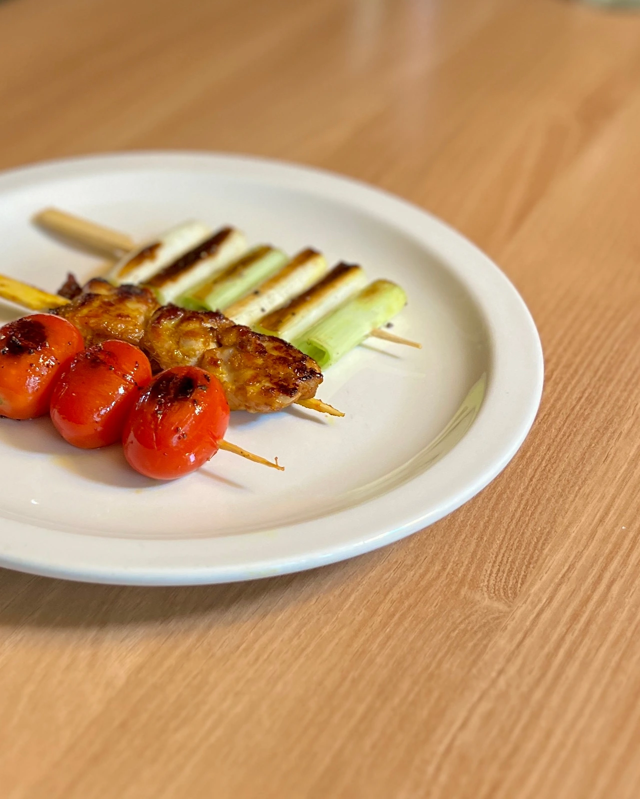 꼬치에 끼운 닭, (싱가포르st) 사테 소스, 대파, 방울토마토, 오일, 후추