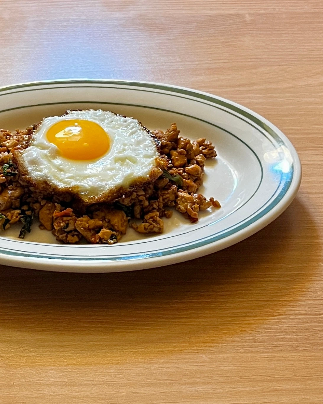 요새 방콕엔 팟 크라파오 무 쌉 전문점도 생겼더라. Phad이 볶다, Krapow가 홀리 바질, Moo가 돼지고기, Sap이 다졌다는 뜻이니, 돼지고기와 홀리 바질 대신에 두부와 깻잎을 넣은 이 조식은 뭐라고 불러야 할까?
