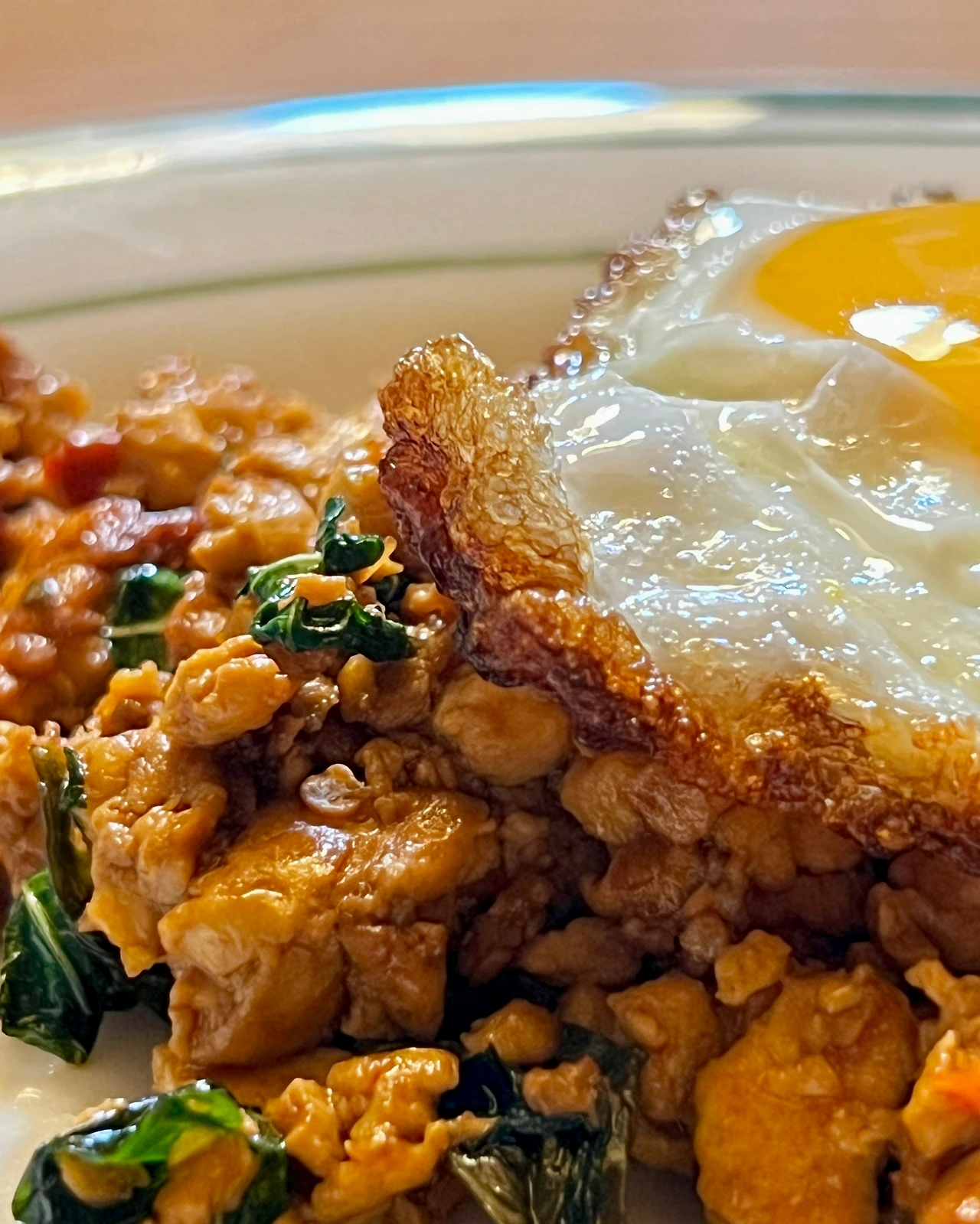 두부와 깻잎으로 만든 약 350kcal 팟 크라파오 무 쌉 Phad Krapow Moo Sap