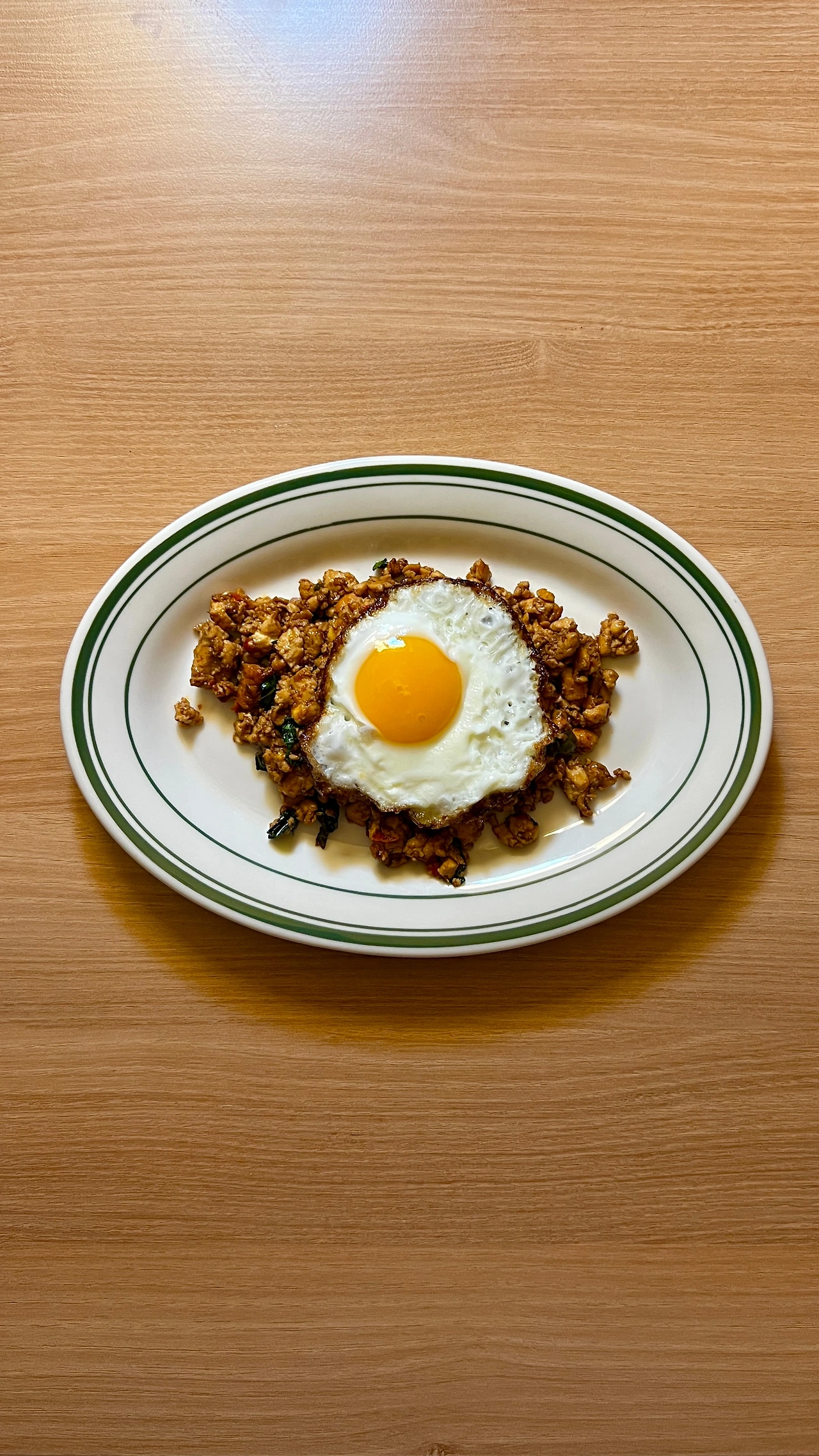 3. 다른 팬에 오일 듬뿍, 계란 1개 써니 사이드업으로 굽는다. 팟 크라파오 무 쌉에 얹는 계란은 오일 듬뿍 넣어 튀기 듯 굽는 게 핵심이다.