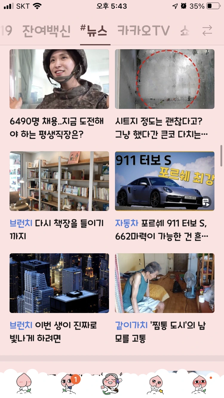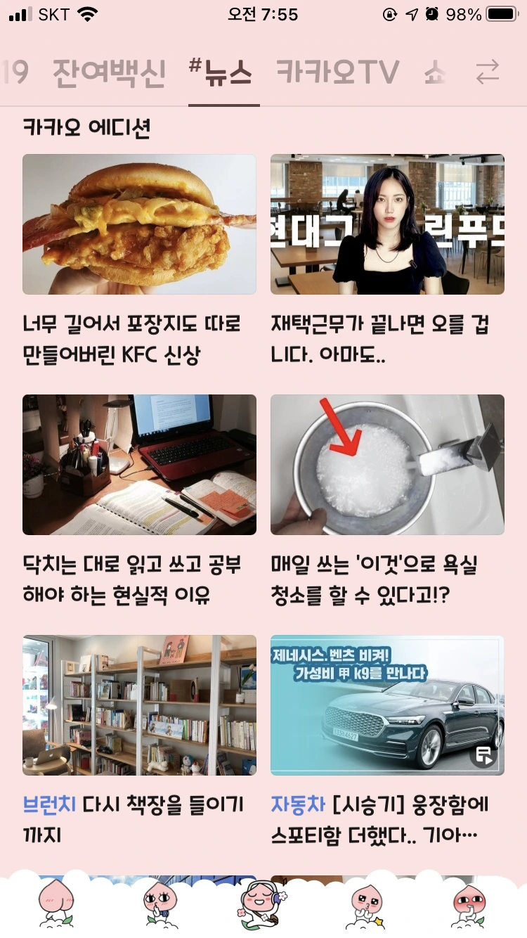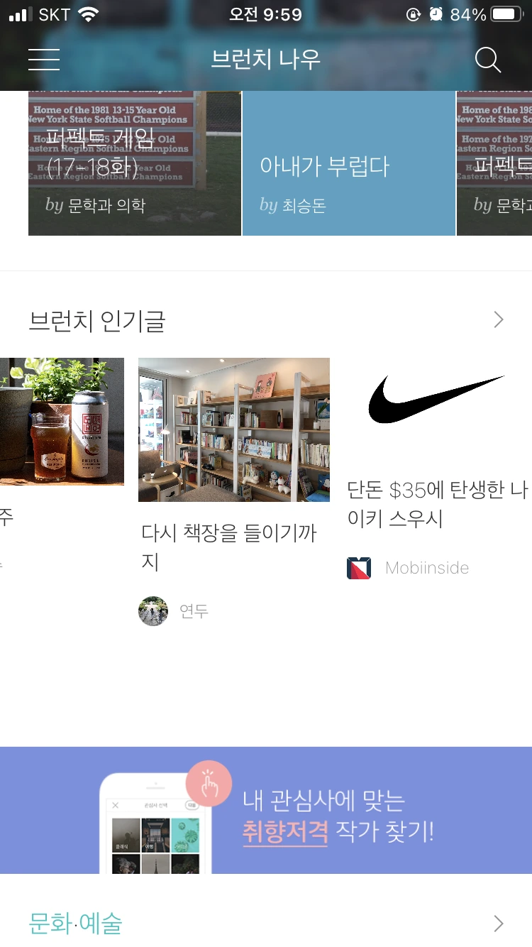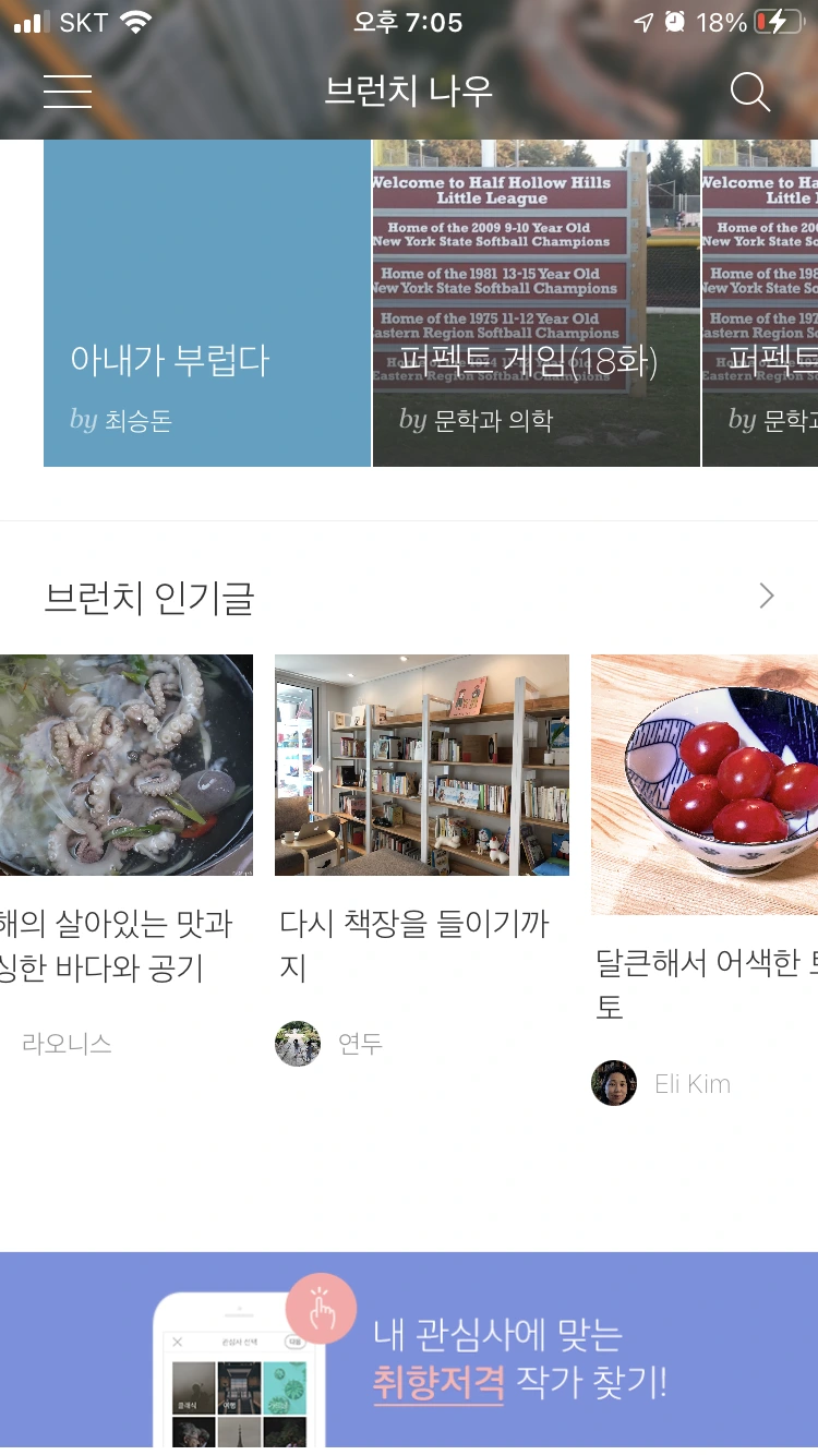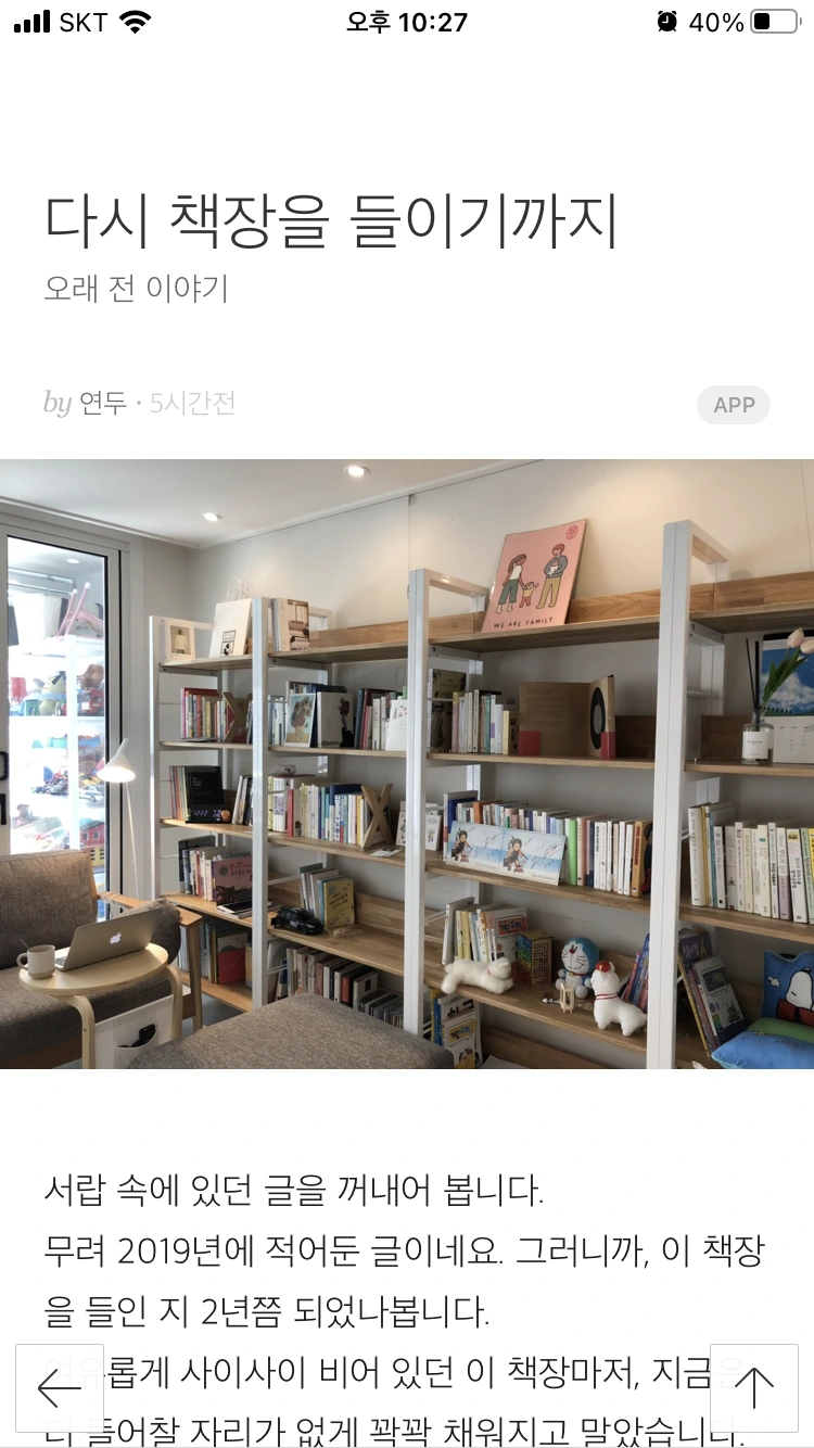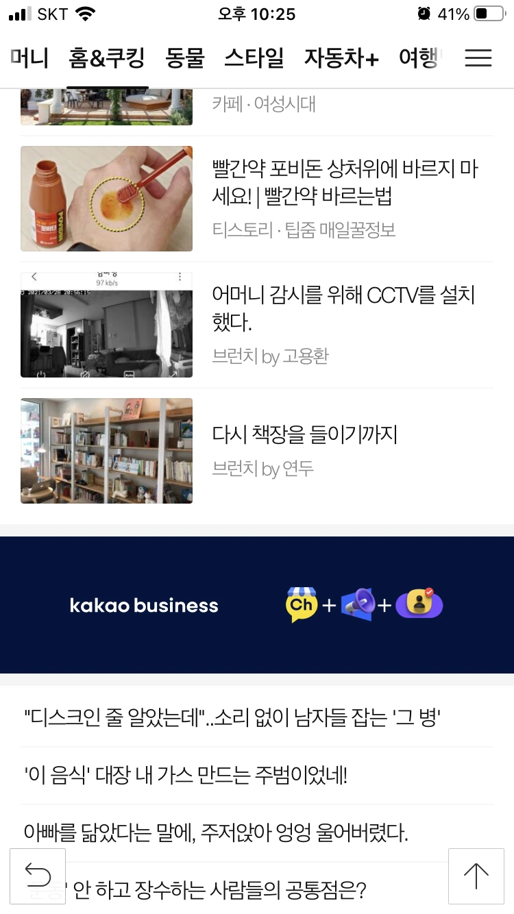 평소에 스마트폰에 다음 어플이 깔려있지도 않아서 앱을 찾아서 깔고, 탭을 샅샅이 뒤져보았더니 왠지 저랑 그다지 어울리지는 않습니다만 '홈&쿠킹' 탭에 올라와 있더라고요(브런치 담당자분께서 집 책장 사진을 보고 후다닥 초이스하신 걸까요ㅎㅎ). 이것도 한번에 바로 나오지는 않고, 새로고침 할 때마다 다른 글이 뜨더라고요. 그렇게 몇 번씩 돌려가면서 새로고침해서 보고 또 보고 하면서 신기해했습니다. 남편에게도 알리고, 친한 지인들에게도 알리고, 페북에도 피드를 남기면서 이 신기함을 공유했습니다. 차마 부모님께는 알릴 수가 없었습니다.. 부모님에게까지 알리면 제 글의 운신의 폭이 더더욱 좁아질 것 같아서요. ㅎㅎㅎ
