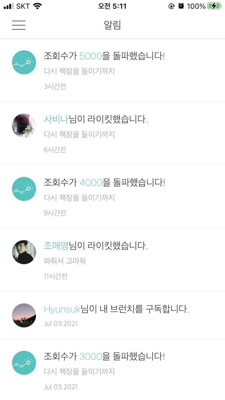 브런치의 마지막 알림은 조회수 6,000이었어요. 현재 약 6,300 정도 되는 것 같습니다. 이렇게 많은 분들이 다녀가셨다니, 그리고 카카오톡이나 다음에 뜨는 소소한 글을 읽는 분들이 이렇게 많으셨다니 놀라기도 했어요. (저는 카카오톡은 대화용+오프 매장 QR코드 확인용+기프티콘 선물 주고받기용 정도로만 쓰고 있어서) 브런치가 다음과 연계되어 있다는 것도 이번에 처음 알았네요. 방금 기사를 찾아보니 브런치 자체가 '카카오가 만든 콘텐츠 퍼블리싱 플랫폼'이라고 하네요.