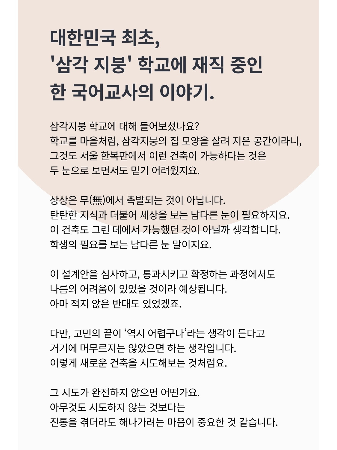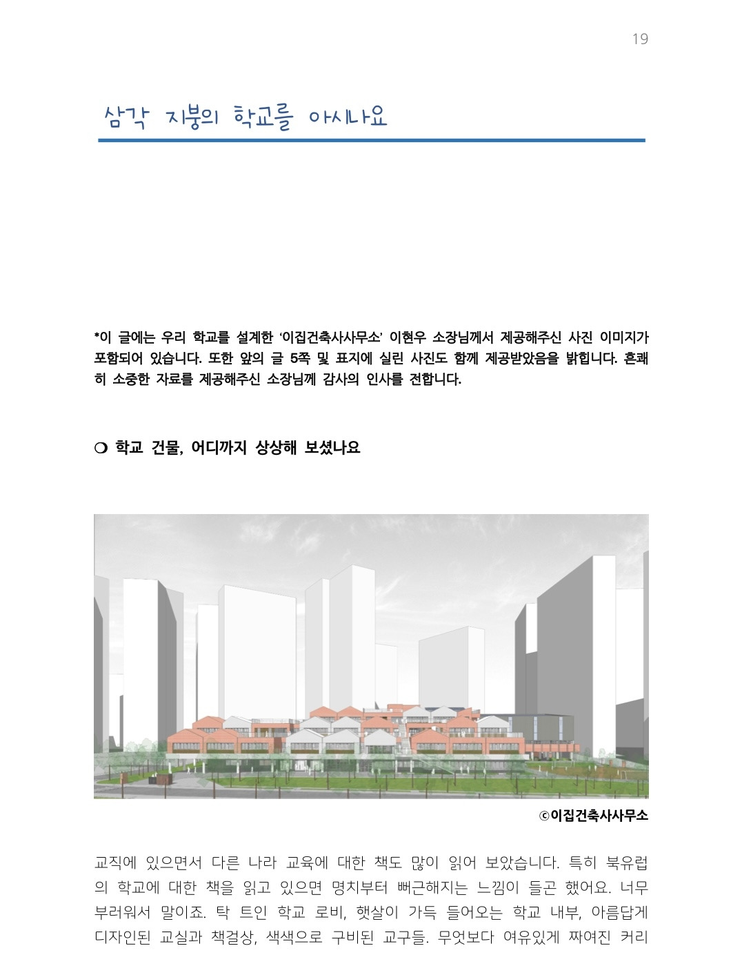 책 표지와 본문에 들어간 학교 조감도는 학교 건축 설계를 담당하신 '이집건축사사무소'의 이현우 소장님을 통해 제공받게 되었는데요, 소장님과 이메일로 소통하며 책에 관한 이야기도 하게 되어 영광이고, 또 새롭고 감사한 경험이었어요. 저작권과 관련하여 문의를 드렸었는데 너무나 흔쾌히 사용할 수 있도록 허락해 주셔서 얼마나 감사했는지 모릅니다. 이 자리를 빌려서 또, 또 한 번의 감사를 전해드립니다. :)