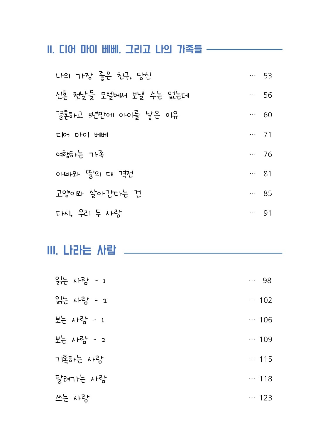 책을 읽으면 고개가 끄덕여지는, 마음결이 아름다운 분들이 있거든요(예를 들면 『나의 두 사람』을 쓴 김달님 작가분의 글을 좋아해요). 그런데 왜, (글을 떠나서) 내 마음은 이렇게 꽃밭이 아닐까, 그런데 어떻게 좋은 글을 쓸 수 있을까, 하는 고민에 마음이 뒤척였던 것 같아요. 공저자로 책을 쓸 때와는 또다른 고민에 좀 휩싸여 있었다고 해야 할까요. 그런데 되게 웃겨요. 저는 김달님 작가님이 아닌데 말이에요. 저는 제 얘기를 해야 하는데 말이지요.