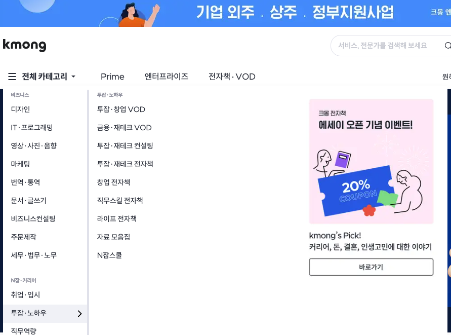 전체 카테고리 중 <투잡/노하우>로 들어가시면 에세이 론칭 기념으로 20% 쿠폰 이벤트도 하고 있어서, 다운로드 후 좀더 저렴한 가격에 구매도 가능하다고 합니다. 꼭 제 에세이가 아니라도 다른 좋은 글도 올라오고 있으니 궁금하신 분들은 활용해보시면 좋을 것 같아요.