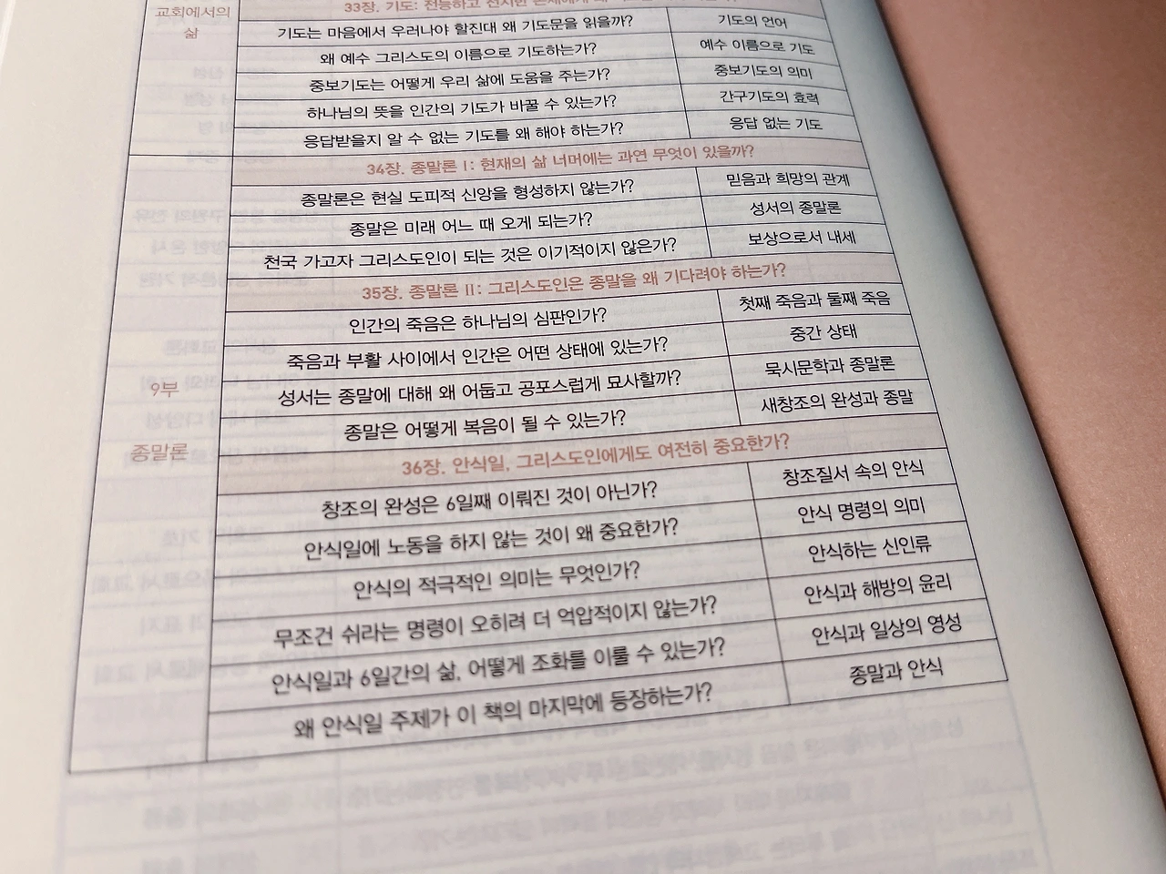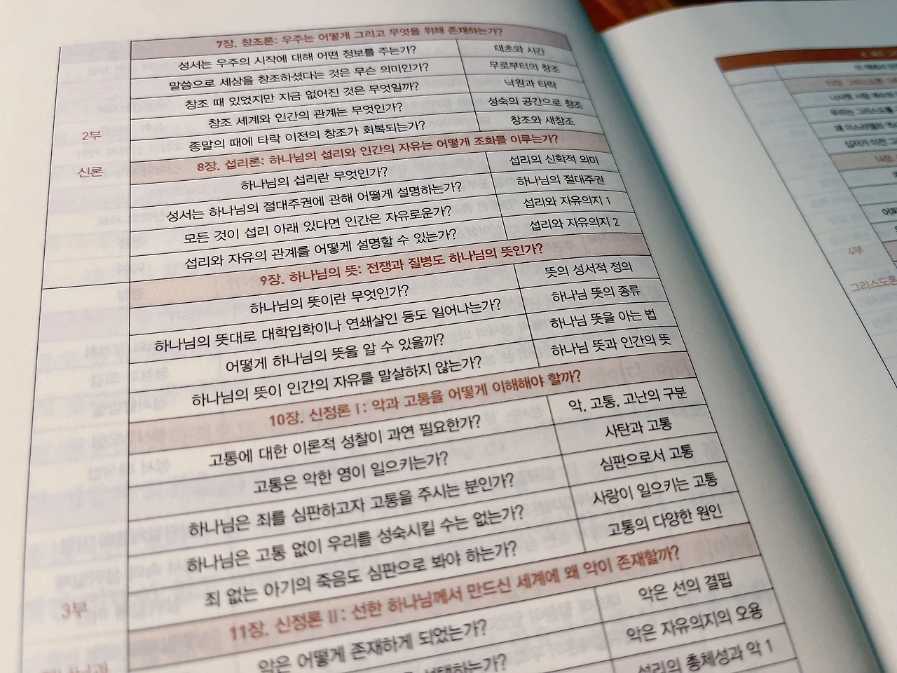 책의 목차 외에도 구체적으로 어떤 이야기를 하려고 하는지 본문에 좀더 자세한 해제가 들어있다. 이런 이야기를 다루는 책이고, 실은 조직신학이란 이런 작업을 하는 학문이라는 걸 보여준다(사실 조직신학 책이 한 권 있는데 여전히 앞부분을 벗어나지 못하고 있다. 다른 이에게 주어야 하나도 싶지만 읽지 않겠지... 중고숍으로 보내야 하나ㅠ.ㅠ 아니, 다시 읽어볼까..?).