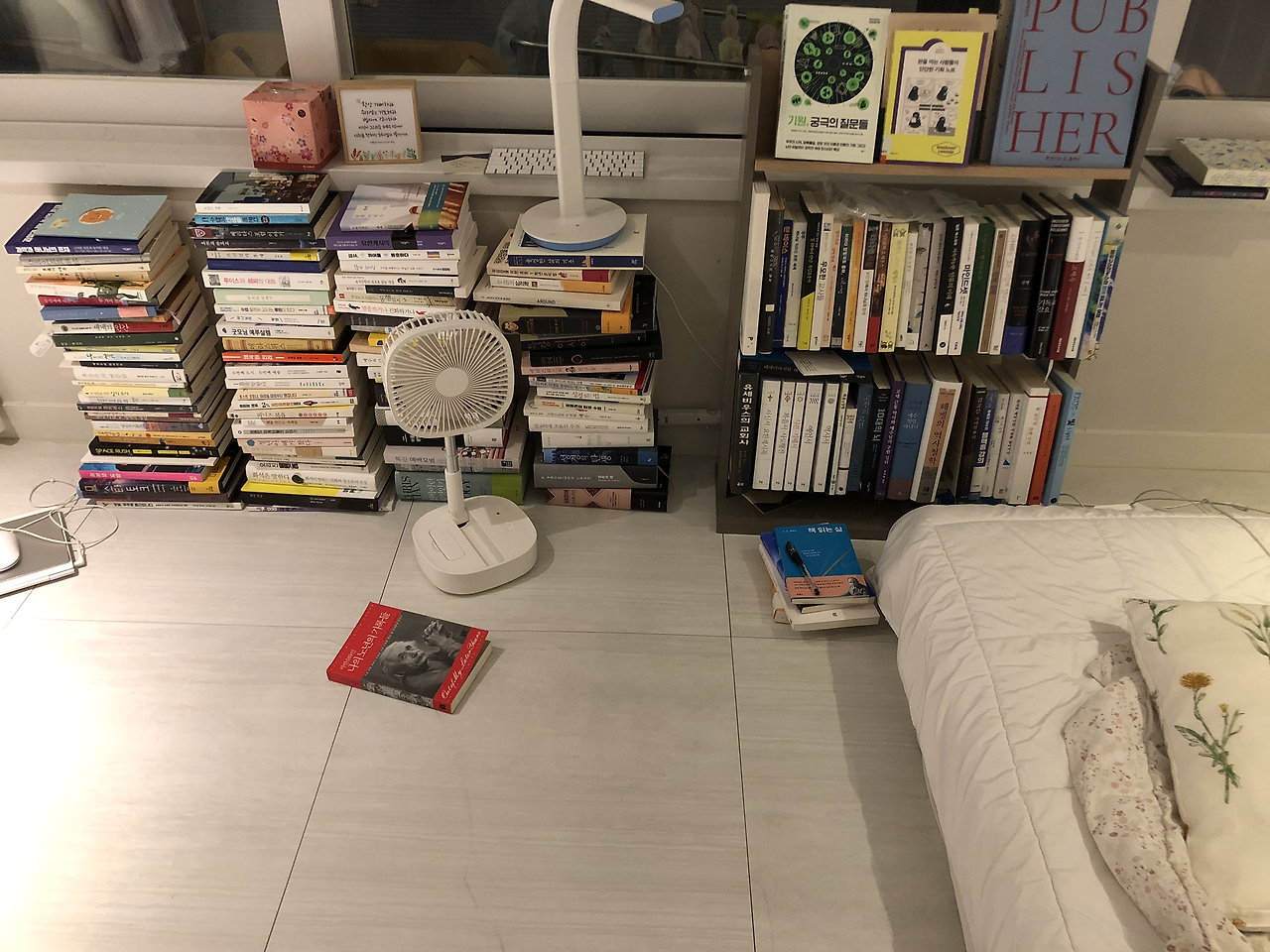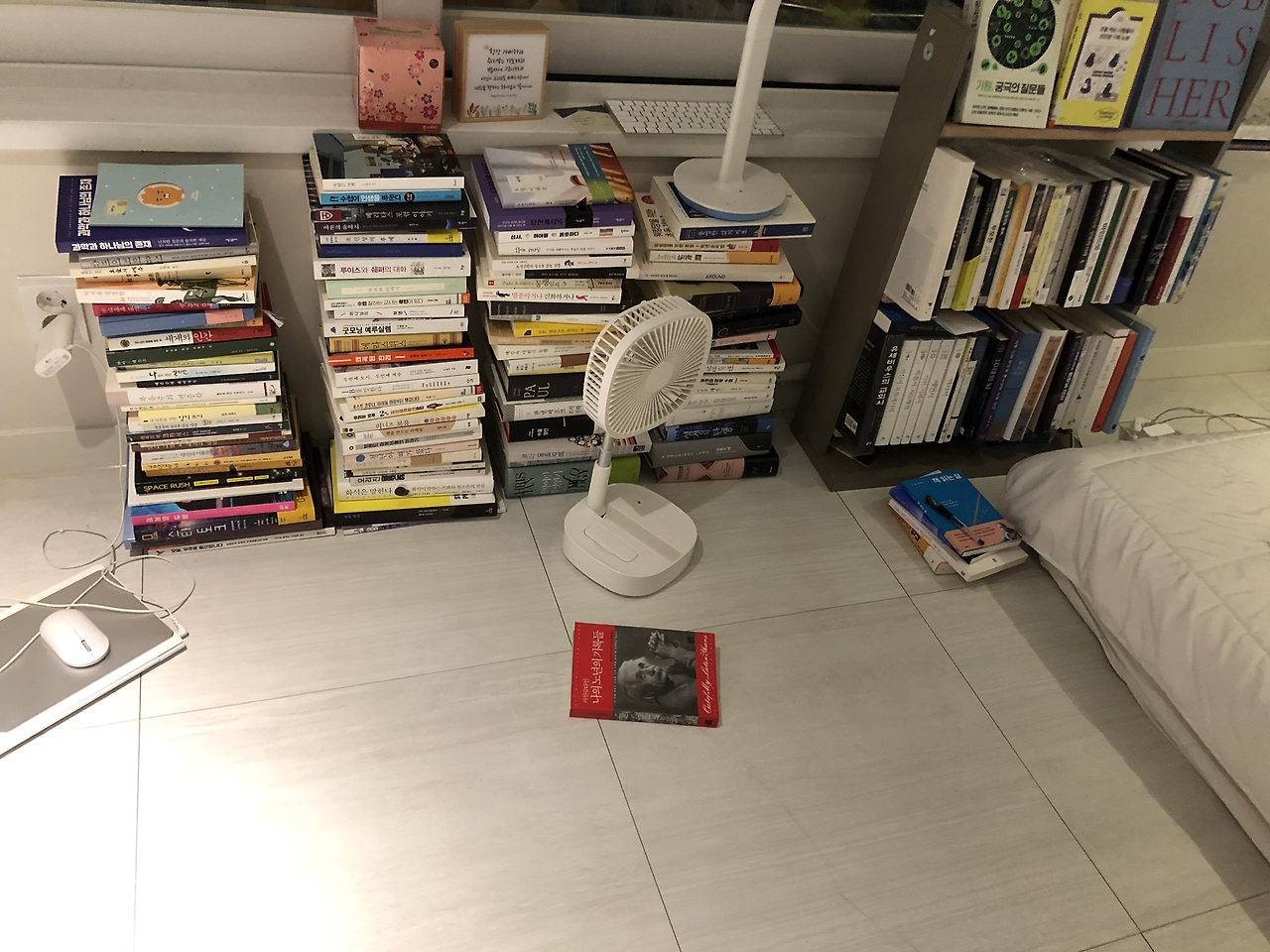 결국 정리가 불가하여 저렇게 북선반 옆에 임시로 쌓아둘 수밖에 없었고. 새 침대가 들어온 지금도 여전히 쌓여만 있다. 저 책들을 다 어찌할꼬. 남편은 저렇게 쌓아둔 책들을 보고 옆에서 이야 고시생이라며 놀림-.-
